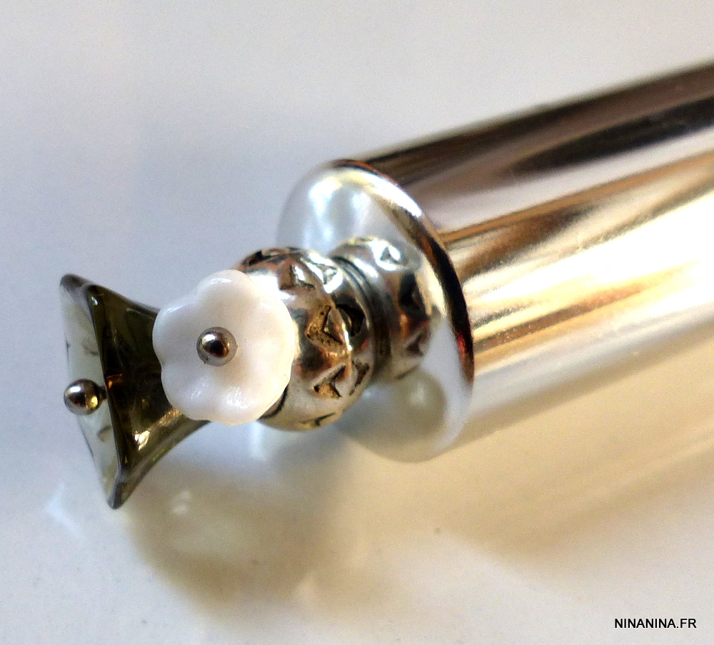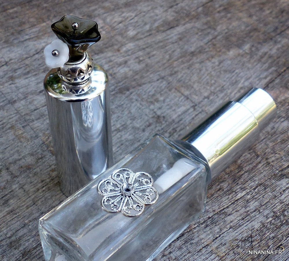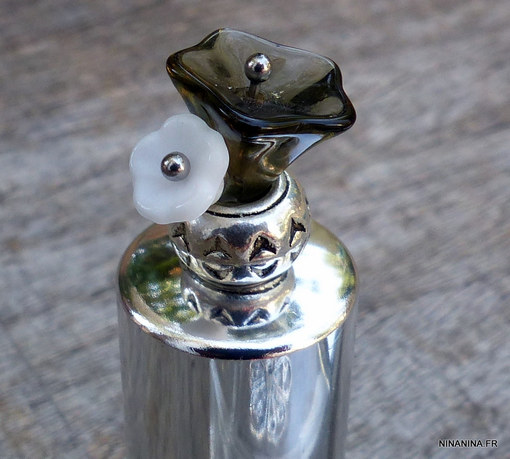 Composé d’un flacon rectangulaire en verre sur lequel est collé une petite fleur en métal argenté, assorti d’une pompe en métal argenté rehaussée de 2 fleurs en verre blanc et gris, il se glisse dans une trousse beauté, une valise ou un sac à main.