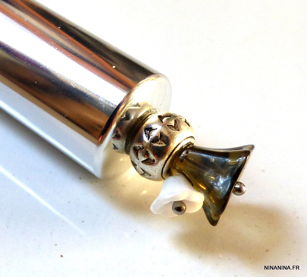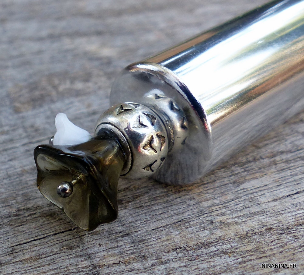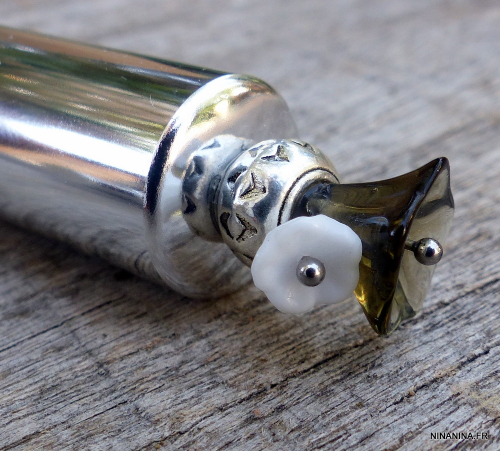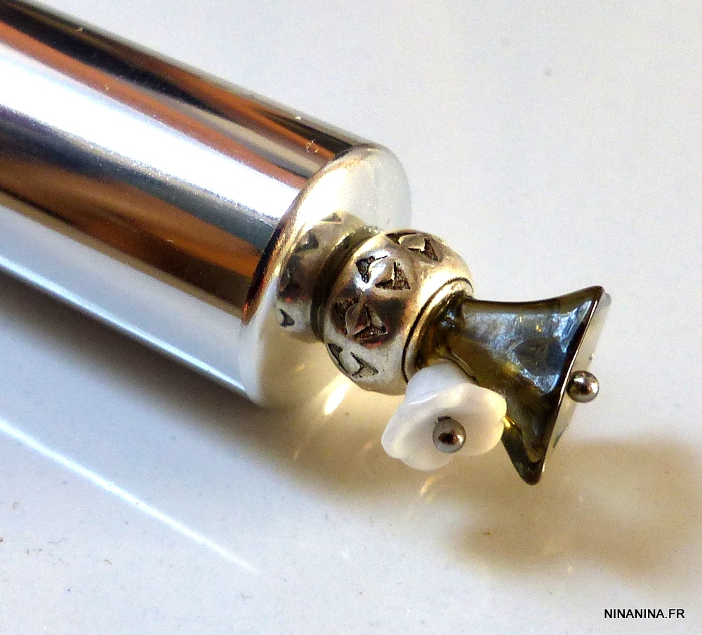 Composé d’un flacon rectangulaire en verre sur lequel est collé une petite fleur en métal argenté, assorti d’une pompe en métal argenté rehaussée de 2 fleurs en verre blanc et gris, il se glisse dans une trousse beauté, une valise ou un sac à main.