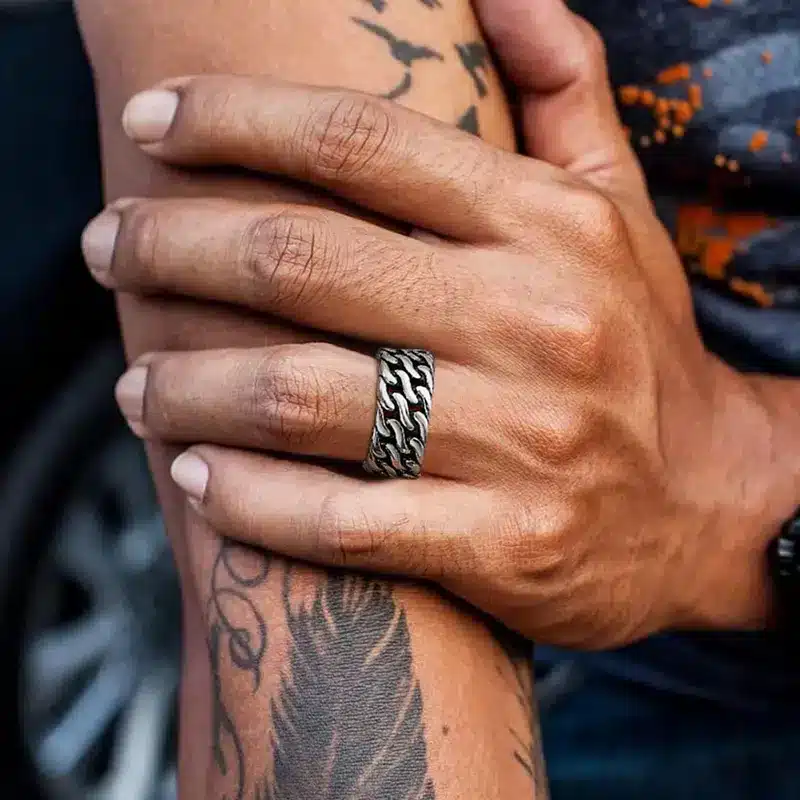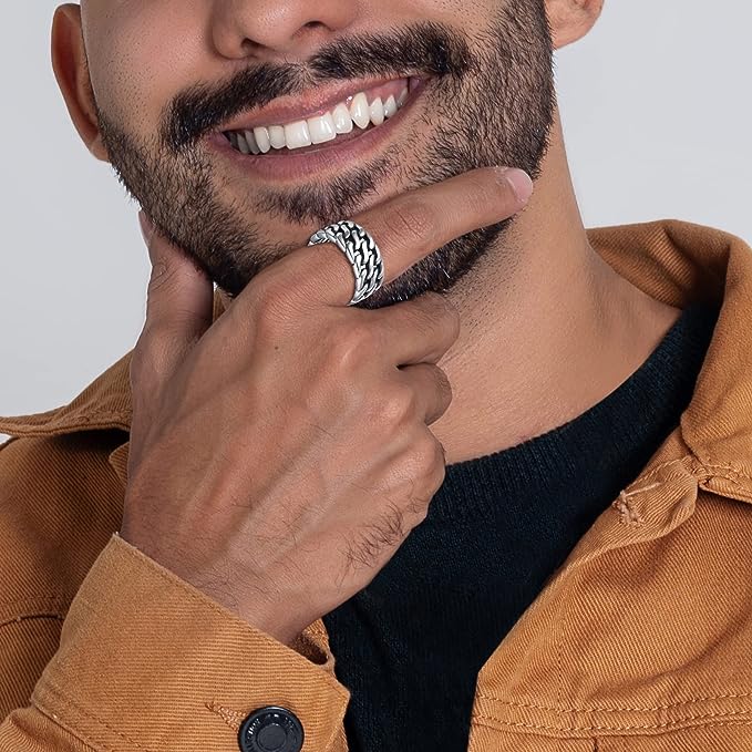 Vous allez adorer cette Bague Anneau Homme chaine torsade Acier inoxydable au caractère certain! Un superbe anneau masculin, à porter sur le doigt de votre choix! Bague de pouce, alliance, bague d’index ou de majeur, cet anneau texturé de 10mm de large vous fera craquer à coup sûr!