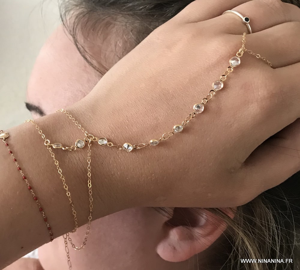 PortĆ© seul, ou accompagnĆ© dāautres chaines de main Ninanina, ce splendide bracelet de doigt, appelĆ© Ć©galement Bracelet bague ou chaine de main, est un bijou peu commun qui est devenu un incontournable de la mode depuis quelques mois !