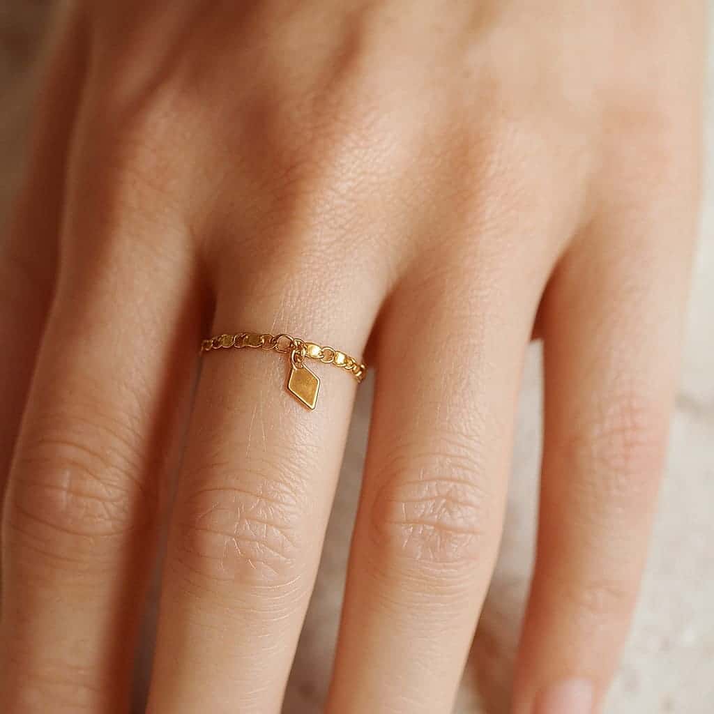 Bague chaine plaqué or artisanale dorée – Maille fantaisie et petit charm losange
