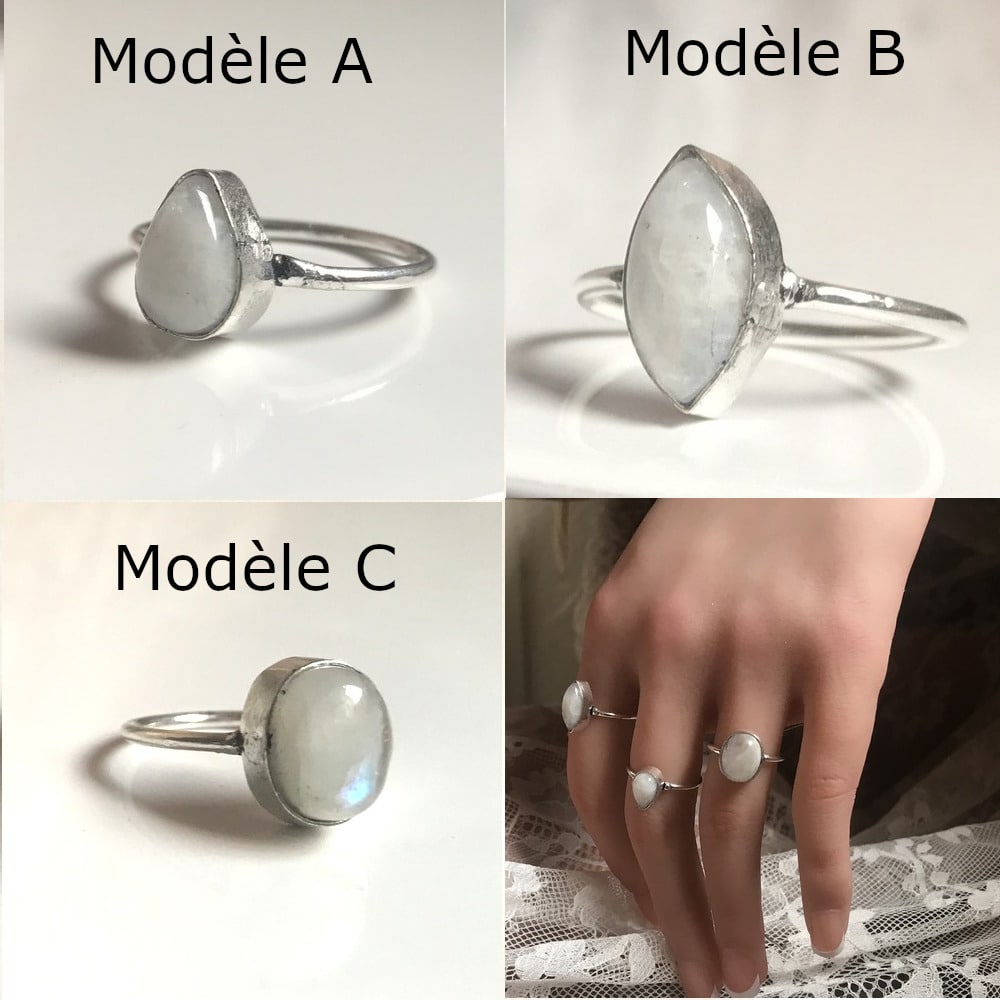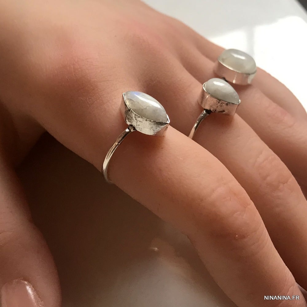 Cette bague élégante en Pierre de Lune est proposée en 3 formes de cabochon : ovale (12X9mm), marquise (14X5mm) et goutte (10X5mm), le plus dur sera de choisir !