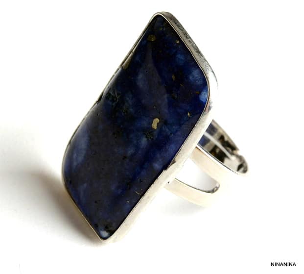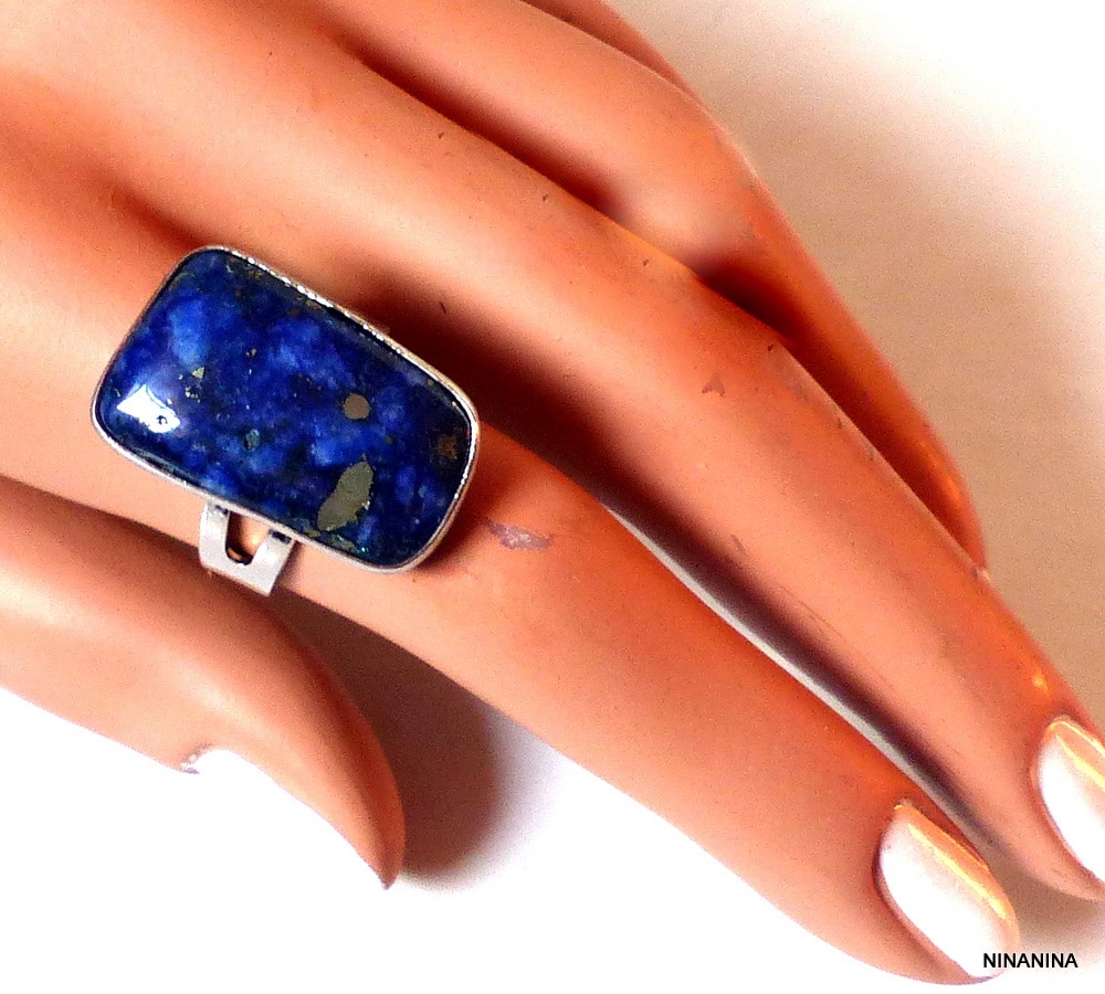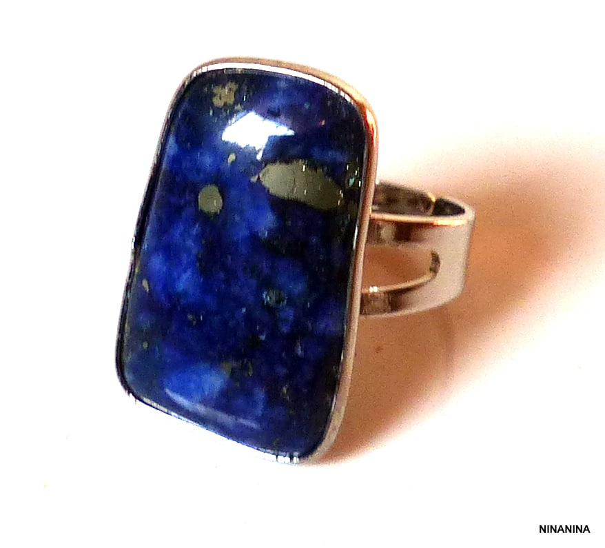 Bague femme réglable lapis lazuli métal rectangulaire. Hauteur : 4 cm. Largeur :  2 cm. Diamètre intérieur : 1,7 cm réglable Livré dans sa pochette d’organza. Bijou 100% fait-main.