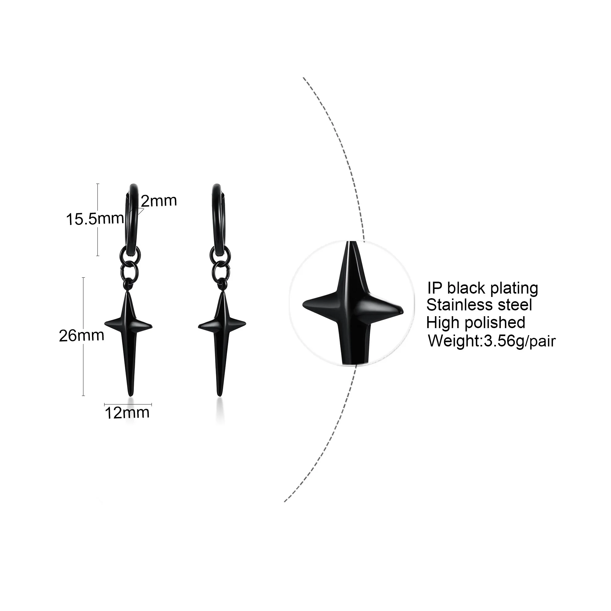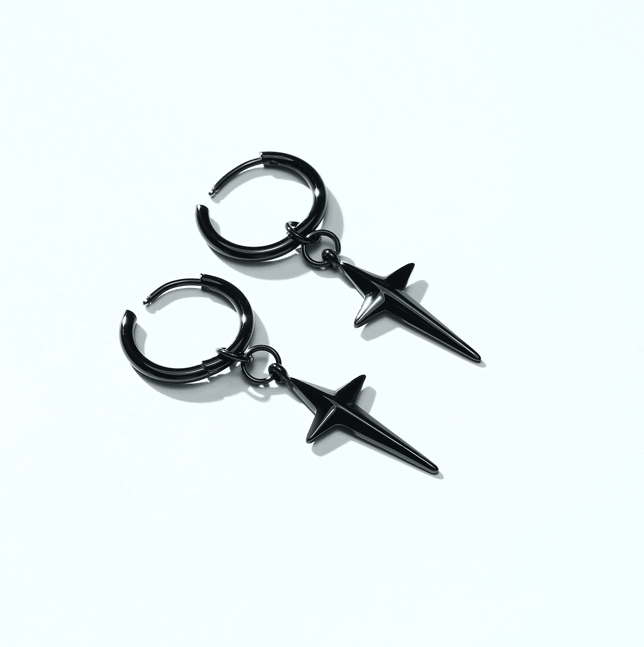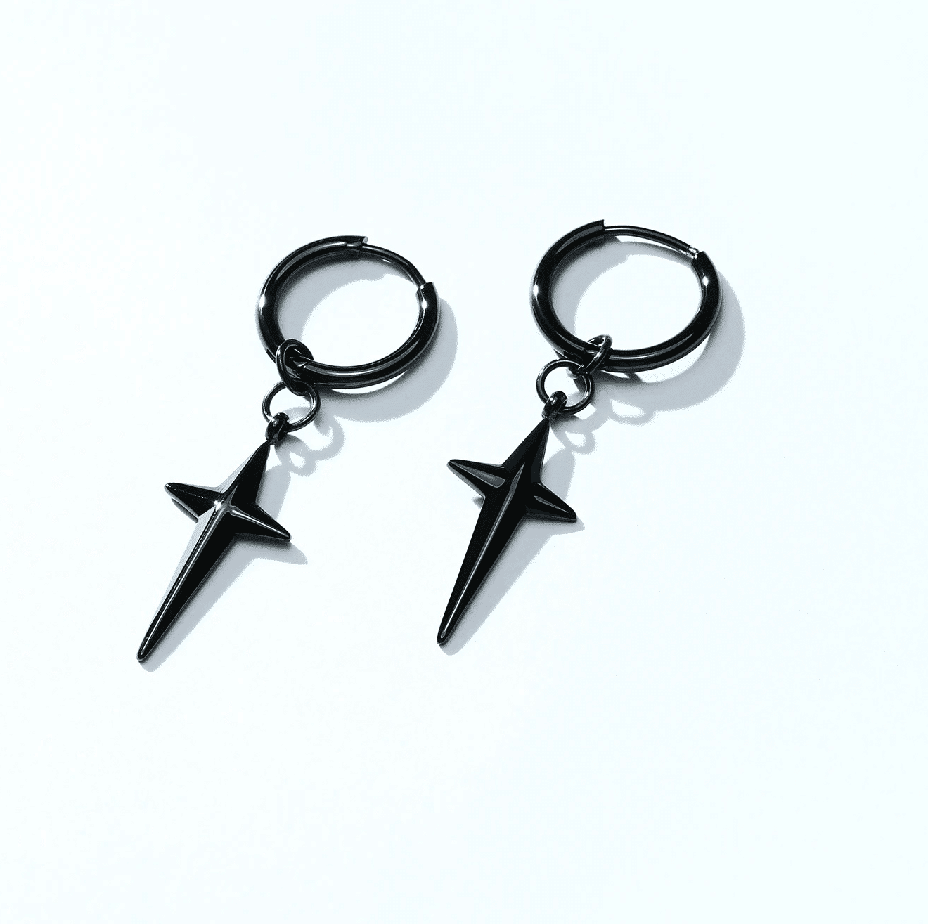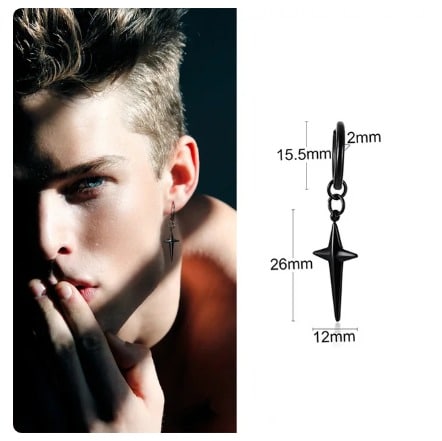 Un anneau noir en acier inoxydable à l’oreille, une croix à quatre pointes qui en tombe, Cette Boucle d’oreille croix au look rebelle ne manque pas de caractère!