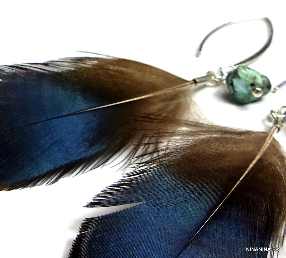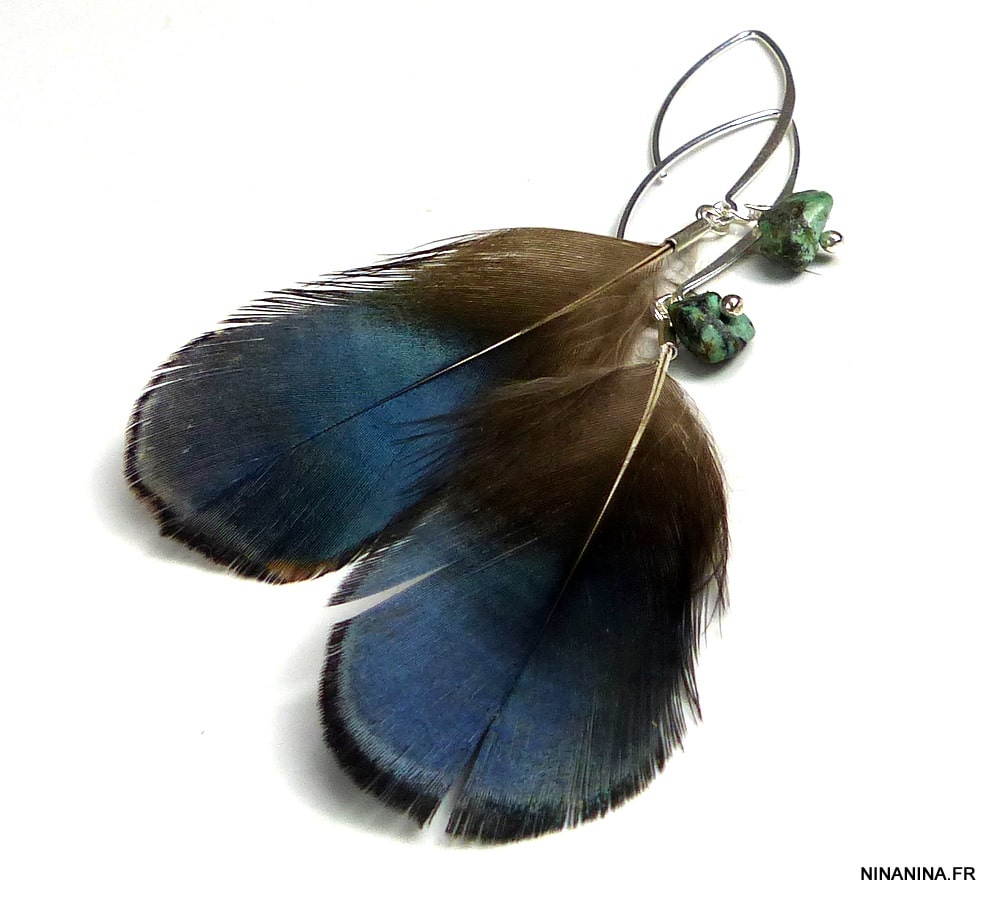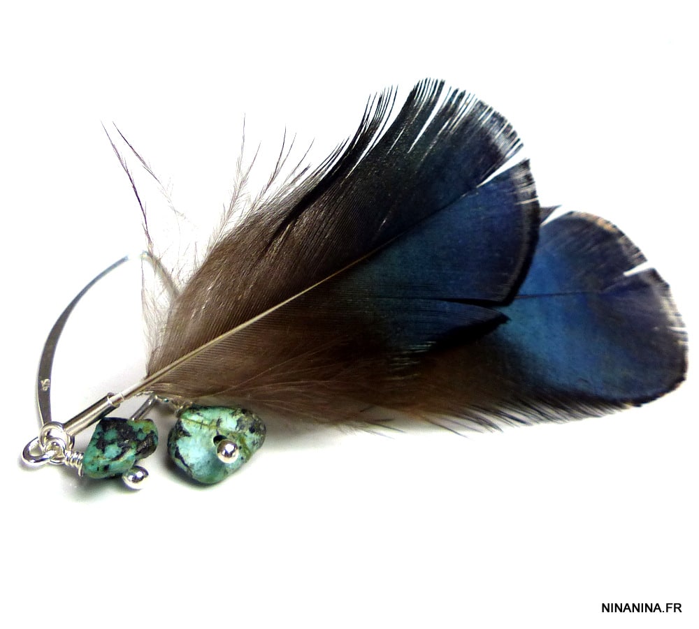 Boucle d’oreille plume pendante Argent 925 massif turquoise africaine