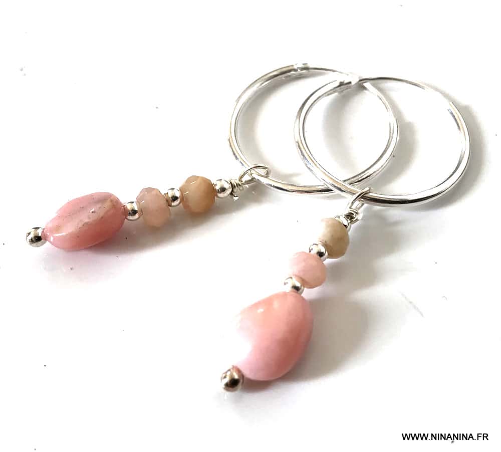 Boucles d oreilles pendentif créoles ou pendantes en opale rose et argent artisanales