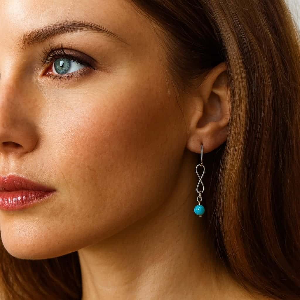 Ces boucles d’oreilles créoles signe infini et turquoise incarnent l’équilibre parfait entre pureté, spiritualité et élégance artisanale.