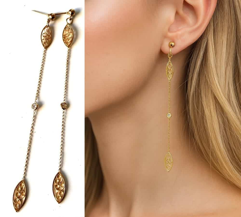 Boucles d’oreilles pendantes longues plaqué or zirconium – Bijou artisanal fait main en France