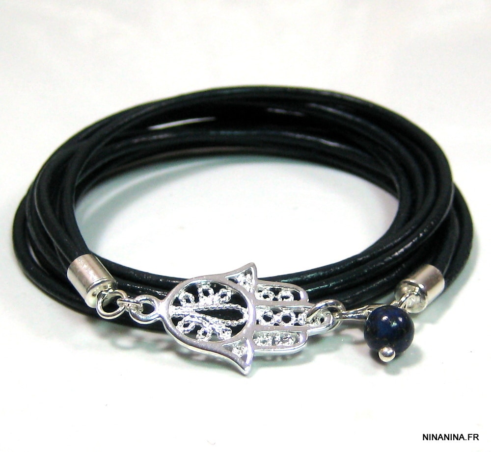 Bracelet lapis lazuli main de fatma argent massif composé d’une main de fatma en argent 925 et d’une petite perle lapis lazuli montées sur un triple cordon de cuir bleu nuit (2mm de diamètre). Dim de la main : 2,5 X 1,6 cm. Longueur totale (fermoir compris) : 56 cm env. Fermoir mousqueton. Livré dans sa pochette d’organza. Bijou 100% fait-main.