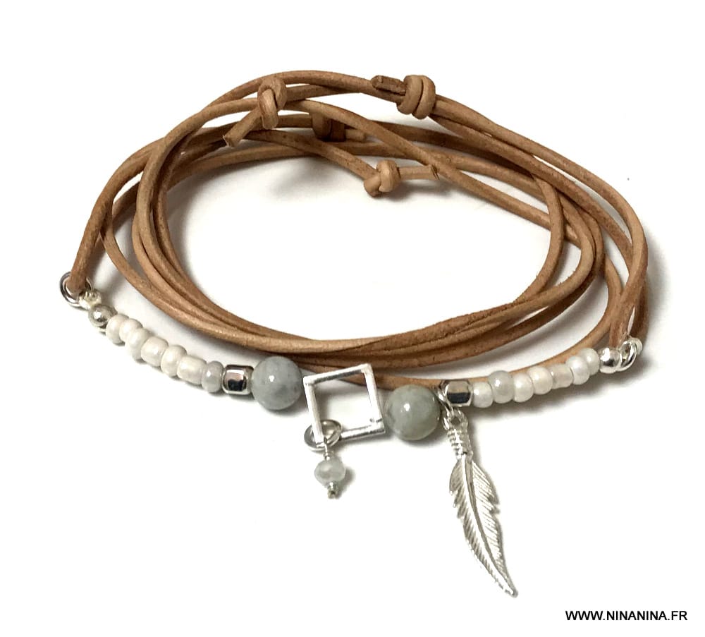 Bracelet multi tours en cuir naturel, décoré de pierres d’Aigue-Marine, de perles de rocaille blanche et d’un pendentif plume en argent 925.Bijou artisanal fait main, ajustable et plein de charme bohème. Un bracelet lumineux et symbolique, entre nature, douceur et élégance. Matériau/Finition : Cuir et argent 925 Pierre : Aigue Marine naturelle Longueur : 80 cm env Diamètre du cordon : 1,5 mm Diamètre des perles en aigue marine : 6mm Fermoir : mousqueton Chainette de réglage Bijou fabriqué en france Livré dans sa pochette prête à offrir Service client : 0688474376 tous les jours de 8h00 à 20h00 Vous…