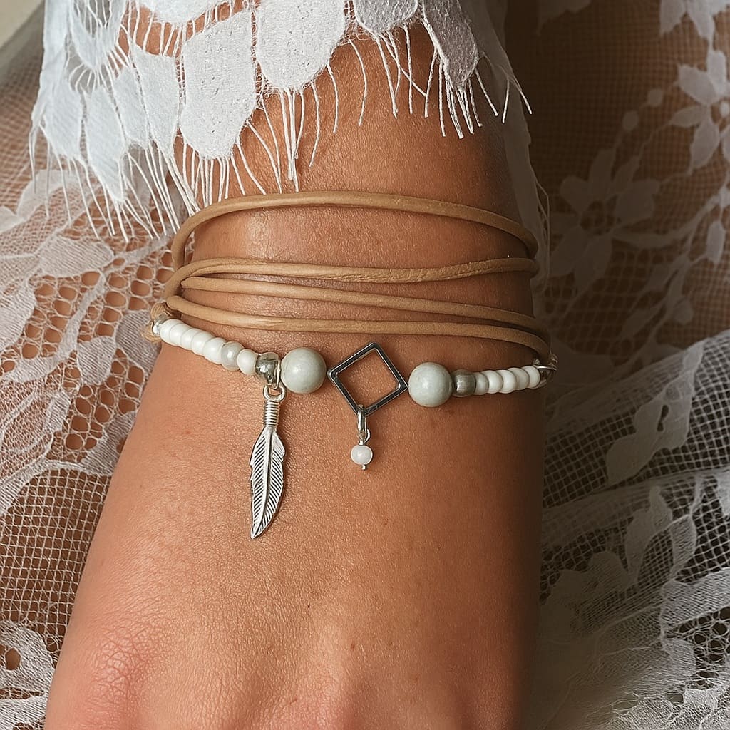 Bracelet artisanal multi tours Aigue Marine et rocaille blanche – pendentif plume argent 925 et cordon cuir