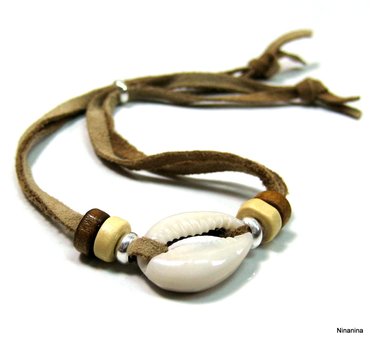 Bracelet avec coquillage cauri Argent 925 sur cordon composé d’un coquillage grain de café blanc et de rondelles de bois et argent 925 montés sur un double cordon de daim caramel (3 mm de large).