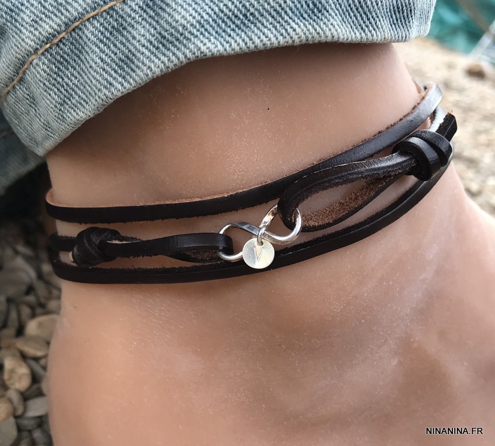 En quête d’un bracelet cadeau homme vraiment original ? Ce Bracelet cheville cuir homme personnalisé et infini argent composé d’une pastille gravée en argent 925 montée sur cordon de cuir noir, à enrouler autour de la cheville (3 tours), est celui qu’il vous faut !