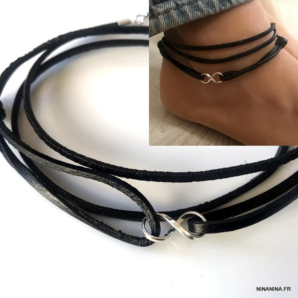 Bracelet cheville cuir homme personnalisé et infini argent