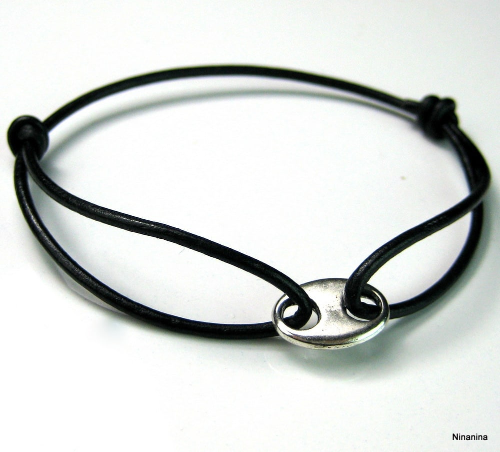 Bracelet cordon cuir composé d’un connecteur grain de café en métal argenté monté sur un cordon de cuir noir (2 mm de diamètre). Existe en noir, marron chocolat, gris, bleu turquoise, rose foncé et naturel. Dim de l’anneau : 1,1 X 1,6 cm. Fermeture par liens coulissants. Longueur : de 17 à 24 cm réglable. Livré dans sa pochette d’organza. Bijou 100% fait main.