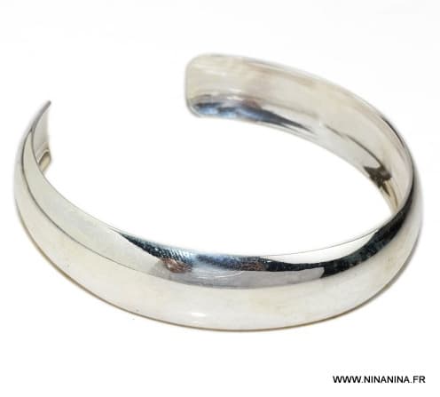 Bracelet demi jonc réglable en argent 925 massif. Bords incurvés. Diamètre : 5,7 cm ajustable. Largeur : 1,3 cm. Livré dans sa pochette d’organza. Poids : 18 g