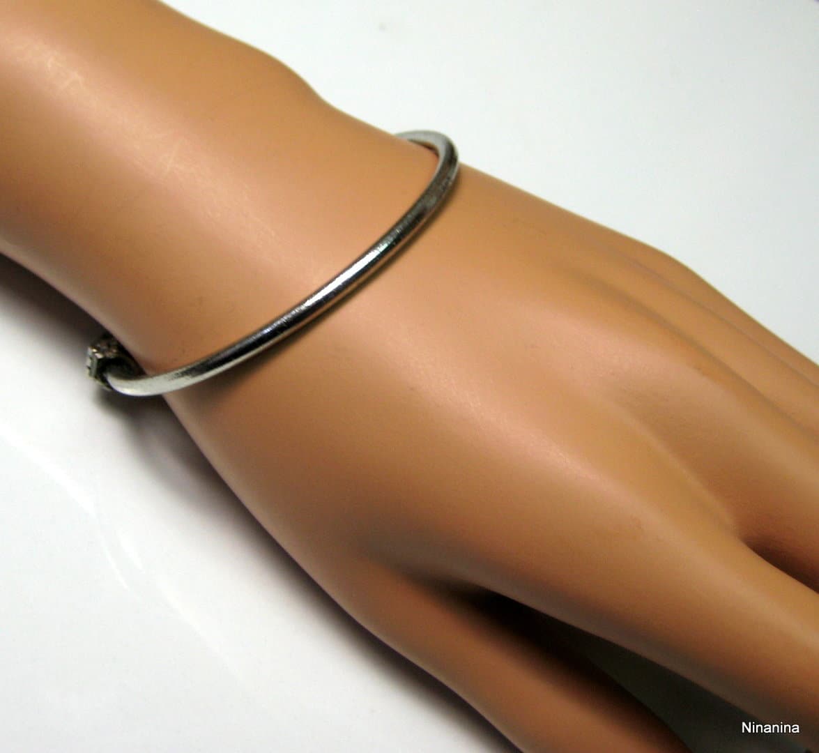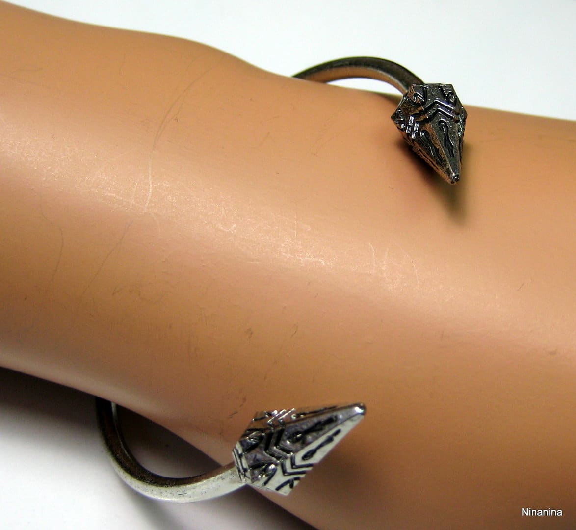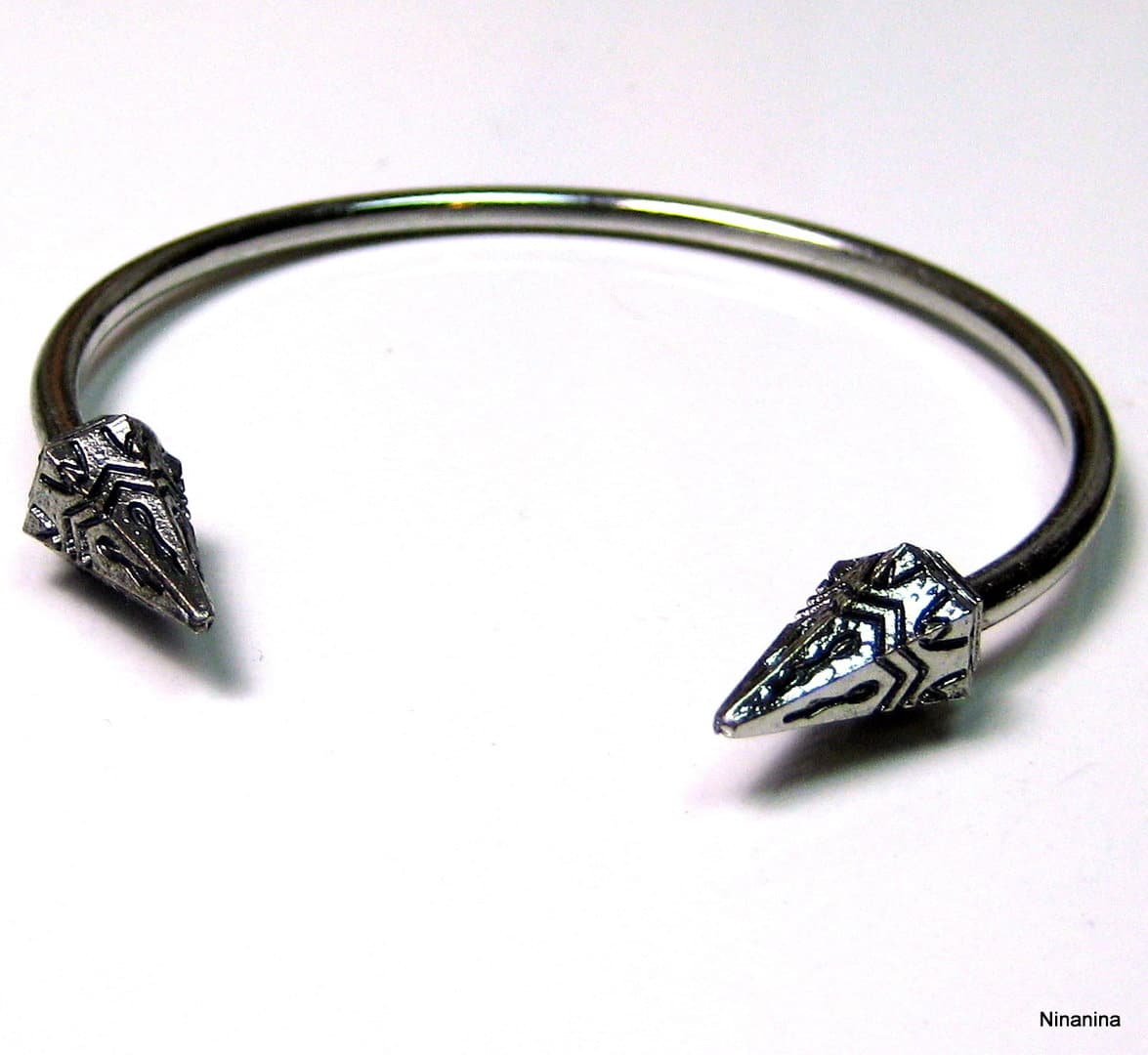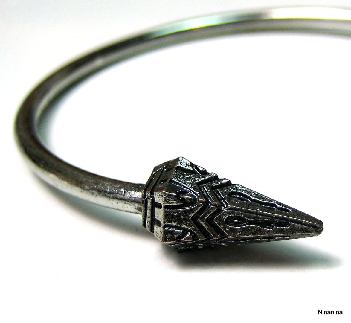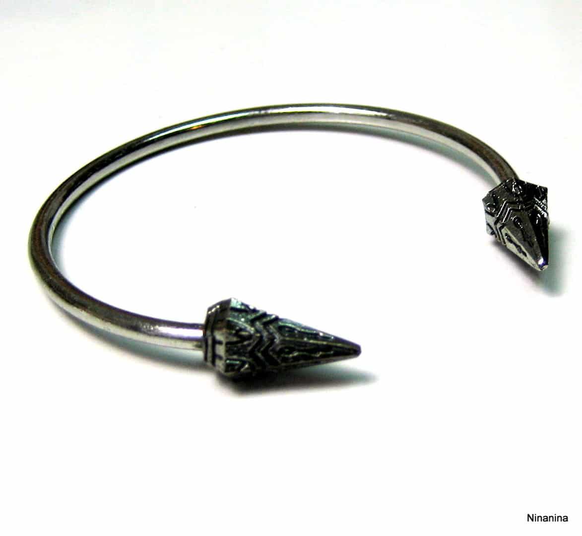 Bracelet ethnique jonc femme flèches métal argenté terminé par deux flèches. Diamètre : 6 cm environ. Epaisseur : 0,2 env. Existe aussi en métal bronze Livré dans sa pochette d’organza. Poids : 5,8 g