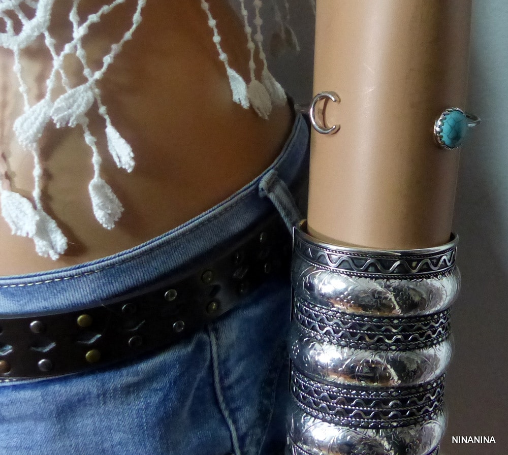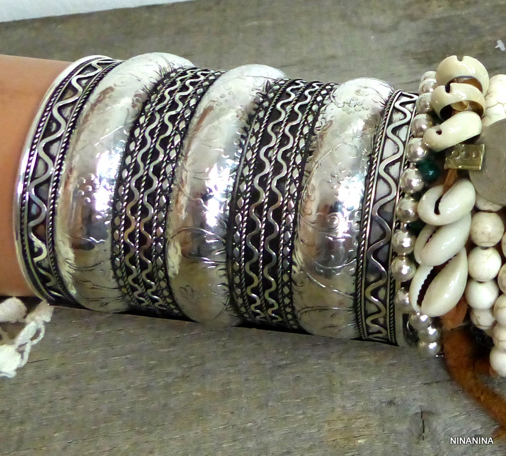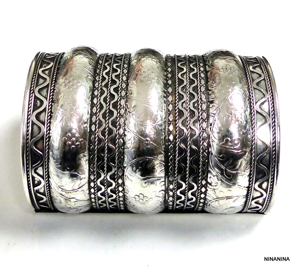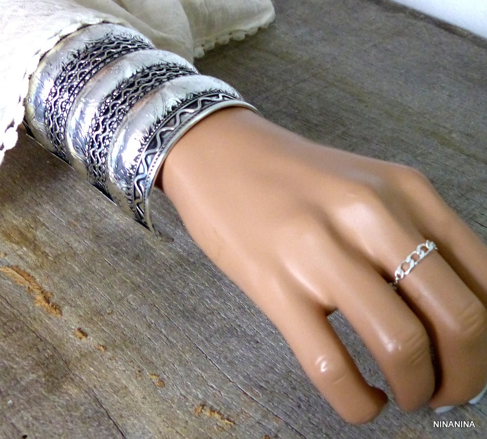 Bracelet Manchette artisanal indien large métal argenté. Fabrication artisanale. Possibilités de petites imperfections dues au travail artisanal. Diamètre : 5,5 cm environ réglable. Largeur : 9,5 cm. Livré dans sa pochette d’organza. Poids : 63 g