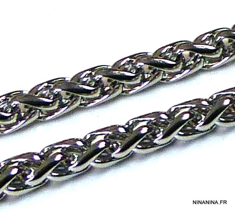 Chaine acier inoxydable maille torsadée. Diamètre : 0,4 cm. Fermoir mousqueton. Longueur totale (fermoir compris): 55 cm. Livré dans sa pochette d’organza. Bijou 100% fait-main.
