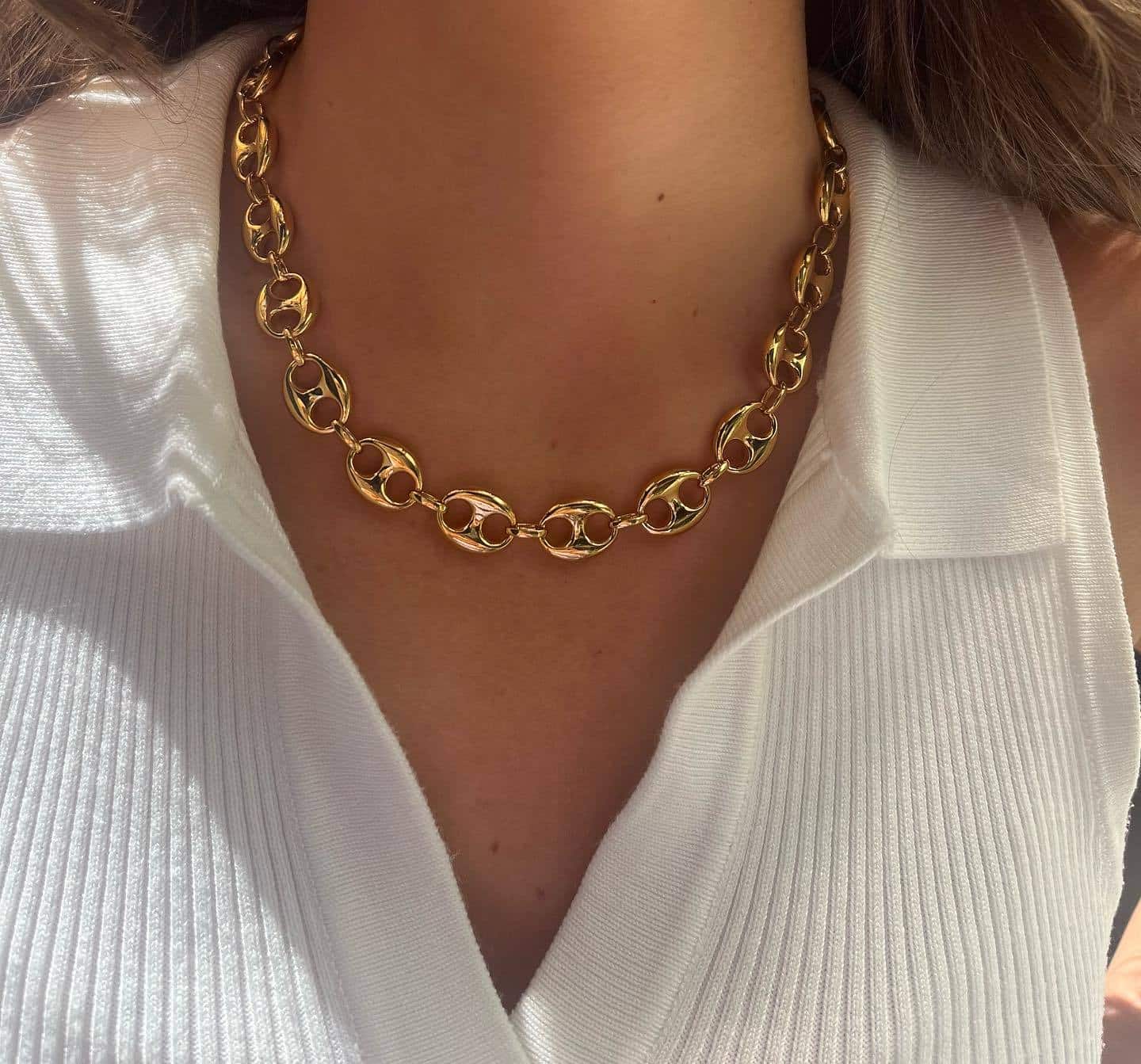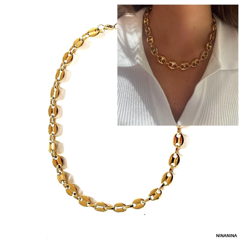 Si vous êtes fan de bijoux dorés, cette chaine grain de café avec sa grosse maille vous séduira à coup sûr ! Disponible également en acier inoxydable argenté.