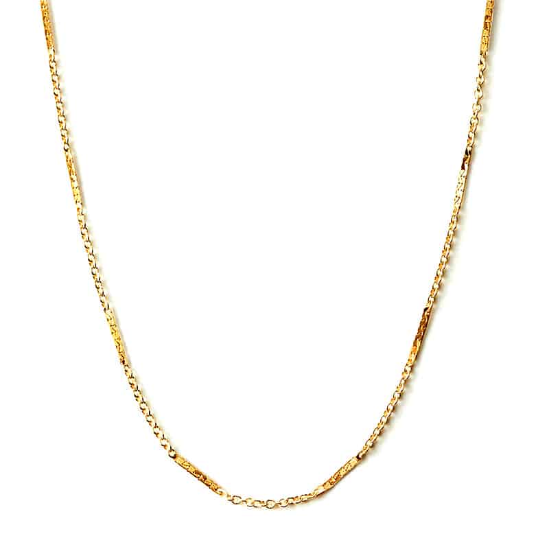 Découvrez sans plus attendre cette Chaine plaqué or femme maille fantaisie gravée est bien celle qu’il vous faut ! Une fine chaîne de maille forçat relie entre eux des petits rectangles gravés de motifs délicats qui prennent vie au ras du cou, cette chaine et sa maille originale, use de sa sobriété sans jamais oublier la carte de la fantaisie! Délicatesse, raffinement et simplicité, voici un bijou plaqué or qui deviendra vite un incontournable de votre boite à bijoux!