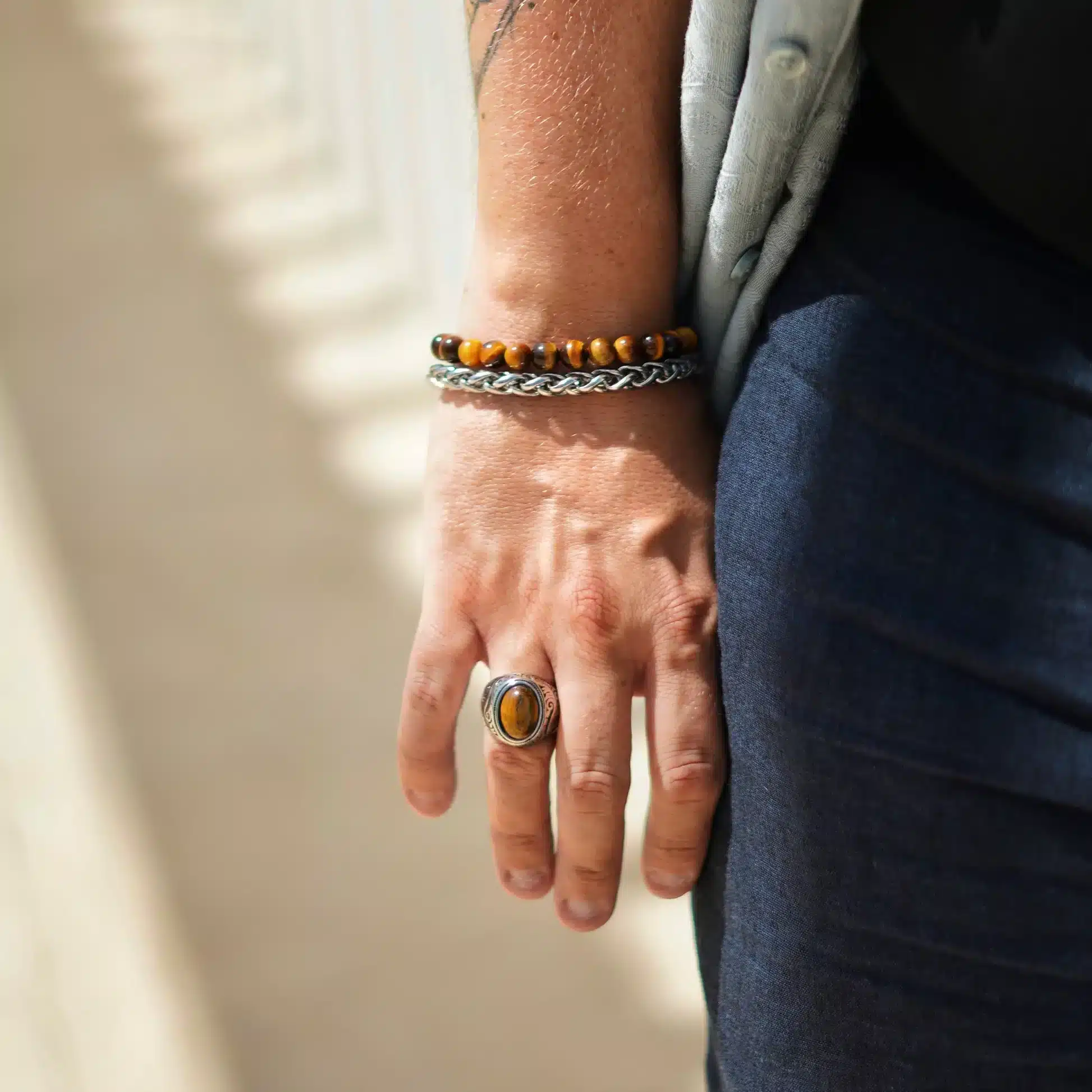- Main dominante : Portez la chevalière sur la main que vous utilisez le plus pour un effet affirmé. Cela mettra en valeur la pierre Œil de Tigre et attirera l’attention.