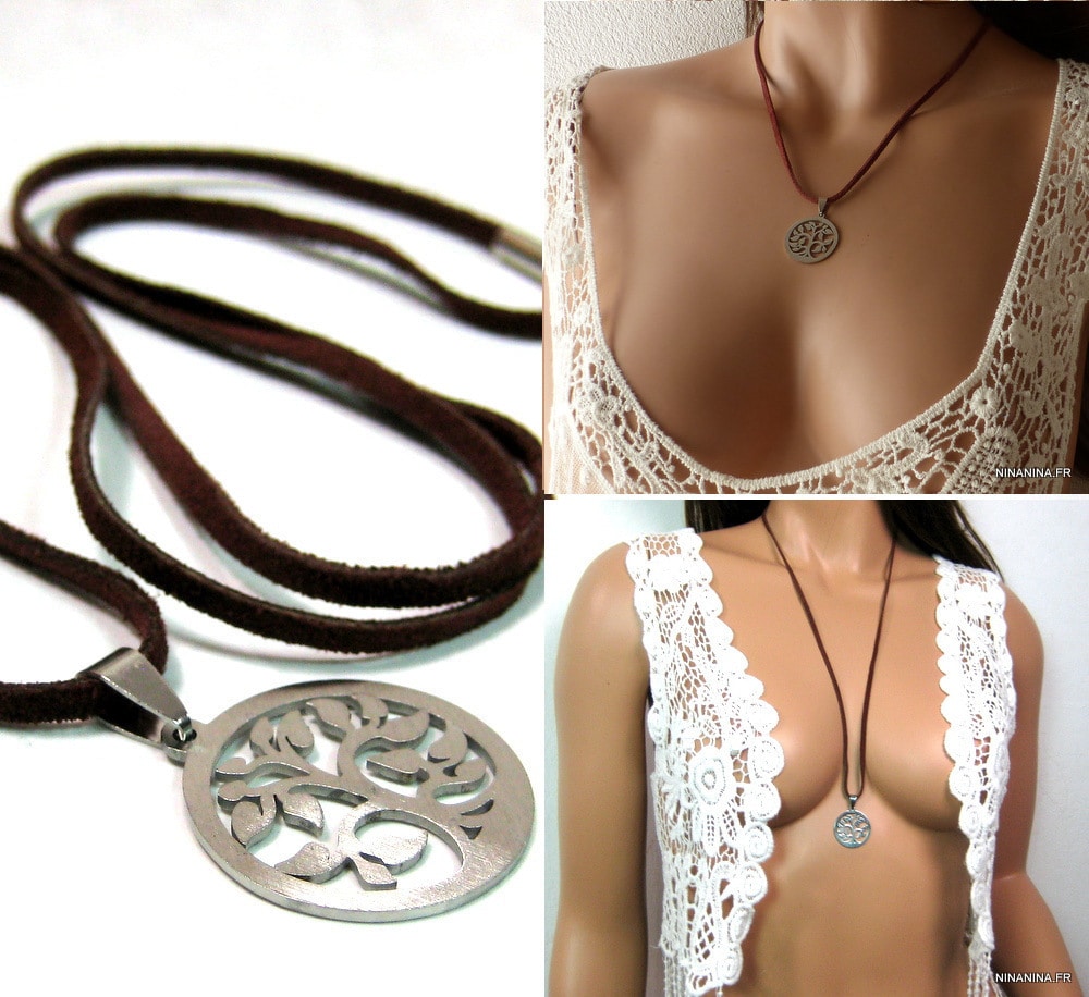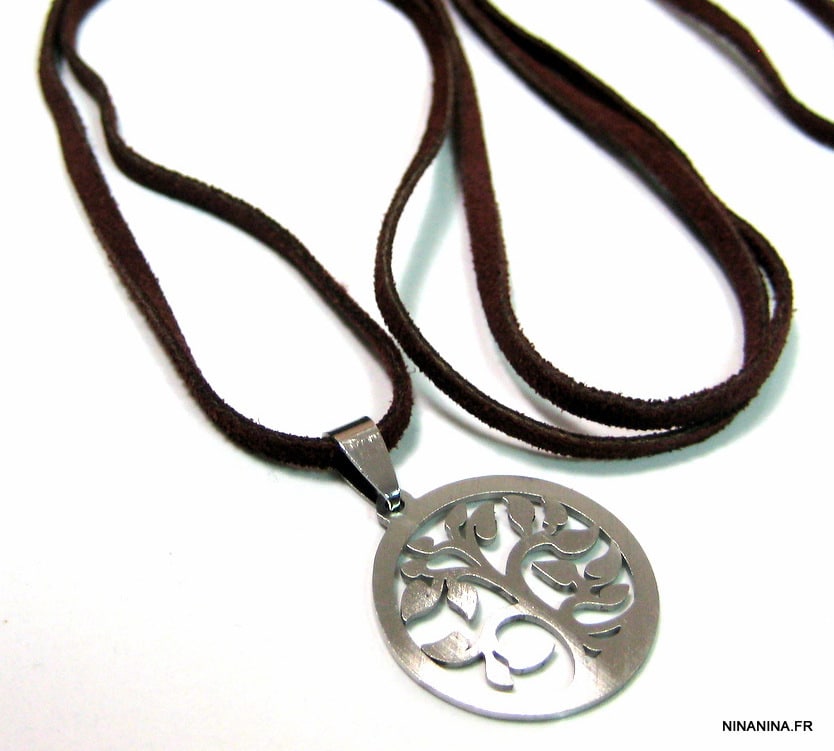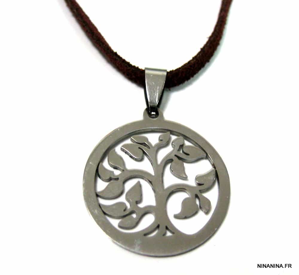 Esprit boheme chic pour ce Collier Arbre de vie Acier inoxydable argenté constitué d’un pendentif Arbre de vie en Acier inoxydable monté sur un lacet de daim marron foncé.