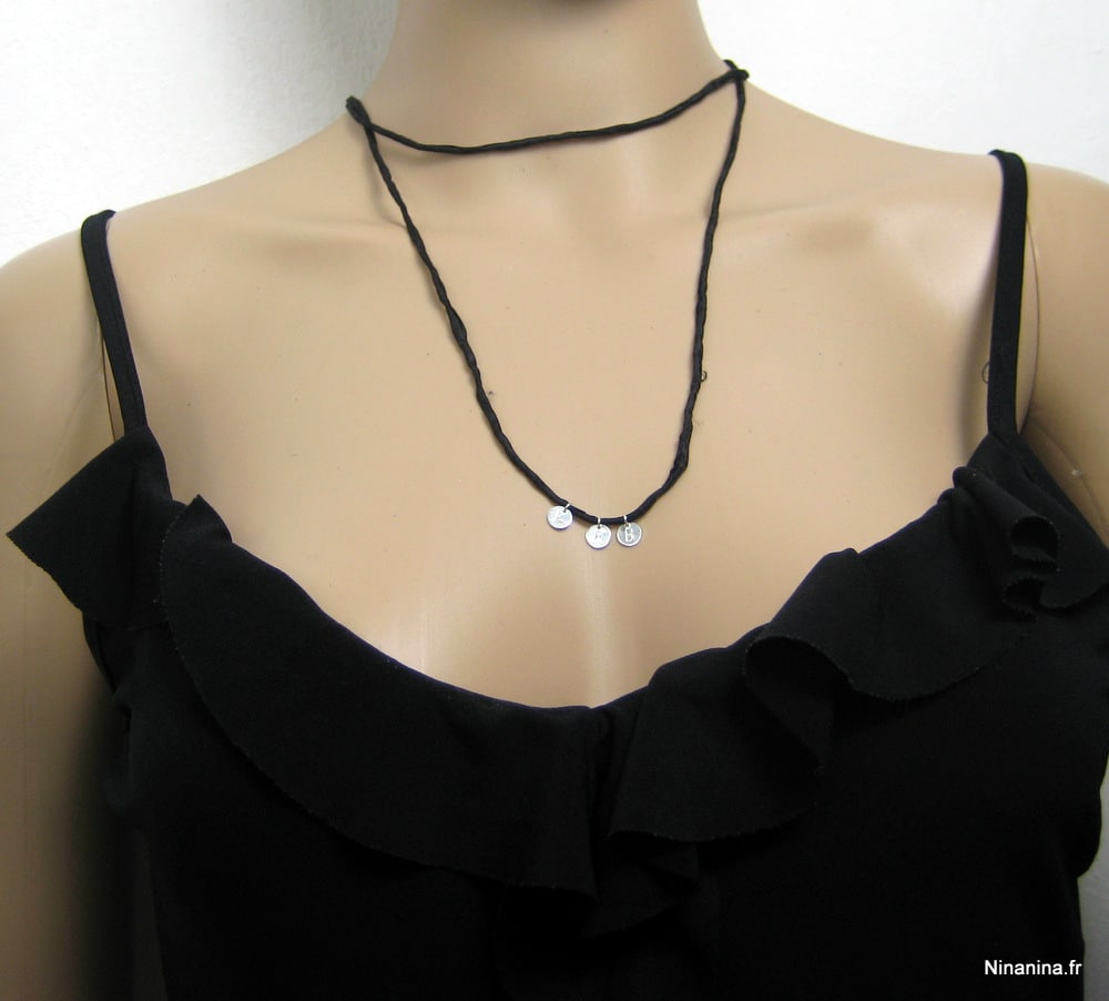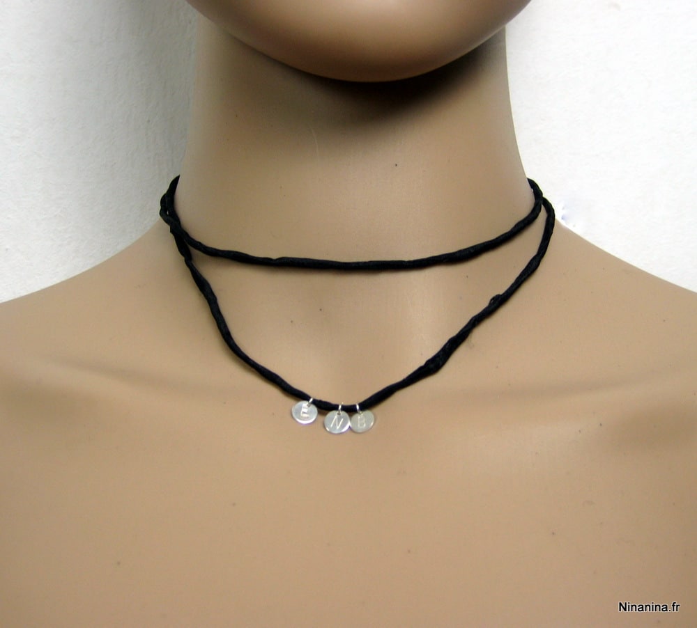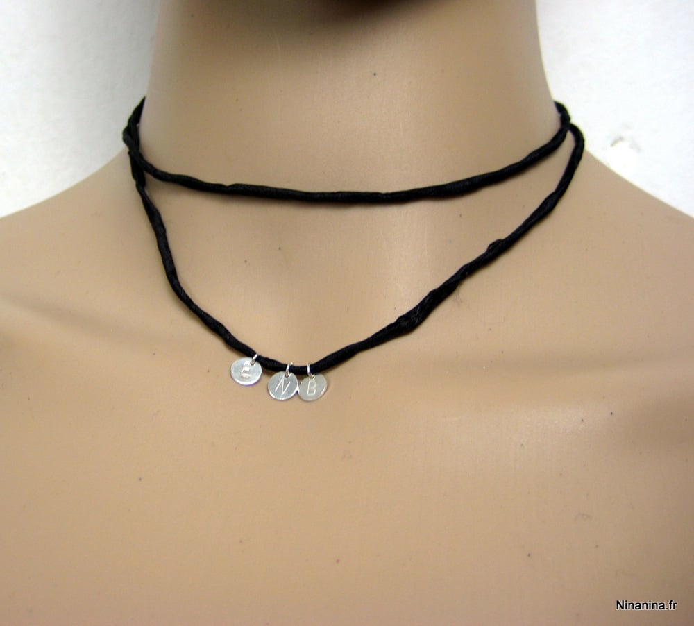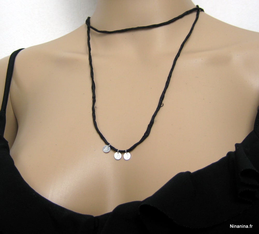 Collier argent massif personnalisé composé de pastilles gravées en argent 925 montées sur un cordon en soie noir (2mm de diamètre) et fermé par une perle en argent 925. A personnaliser avec les lettres de votre choix (à indiquer en commentaire). Diamètre des pastilles : 0,6 cm. Longueur (fermoir compris) : 110 cm. Livré dans sa pochette d’organza. Bijou 100% fait-main. Poids : 1 g
