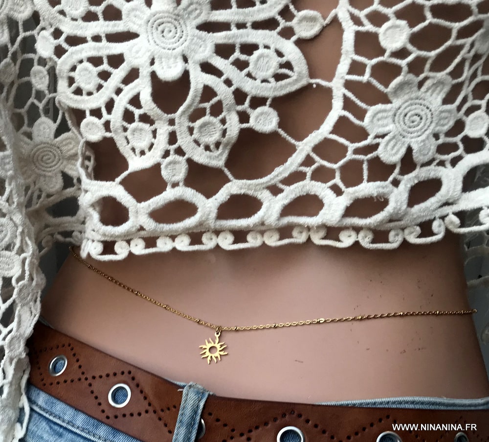 Mettez vos jolies formes en valeur avec ce Collier autour de la taille soleil acier inoxydable doré sensuel et raffiné et sa maille satellite aux petites boules délicate en acier inoxydable plaqué or et son pendentif original en forme de soleil! Cette Chaîne de taille, aussi appelée chaine de hanche ou chaine de ventre, est terminée par un délicat fermoir mousqueton, sûr et facile d’utilisation et d’une chainette de réglage.