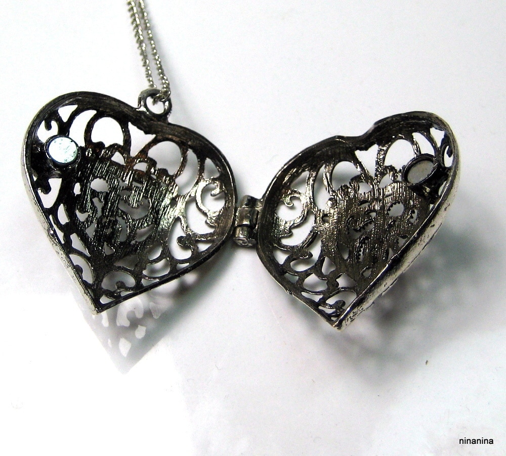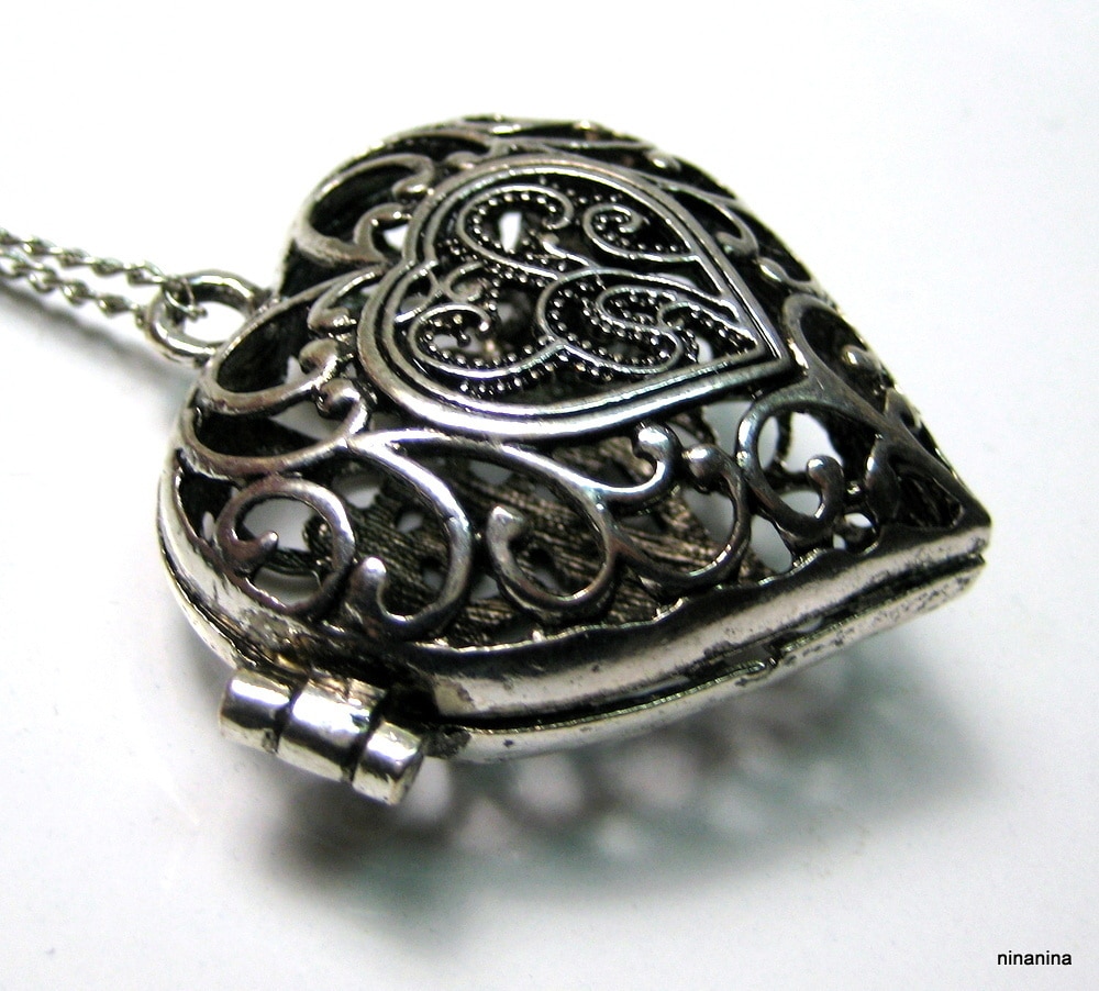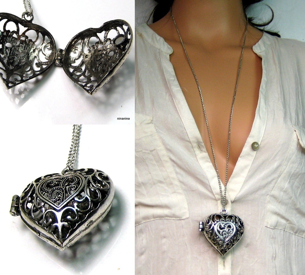 Collier avec gros coeur porte photo – Sautoir métal argent composé d’un pendentif coeur porte photo en métal argenté filigrané monté sur une chainette en acier inoxydable.