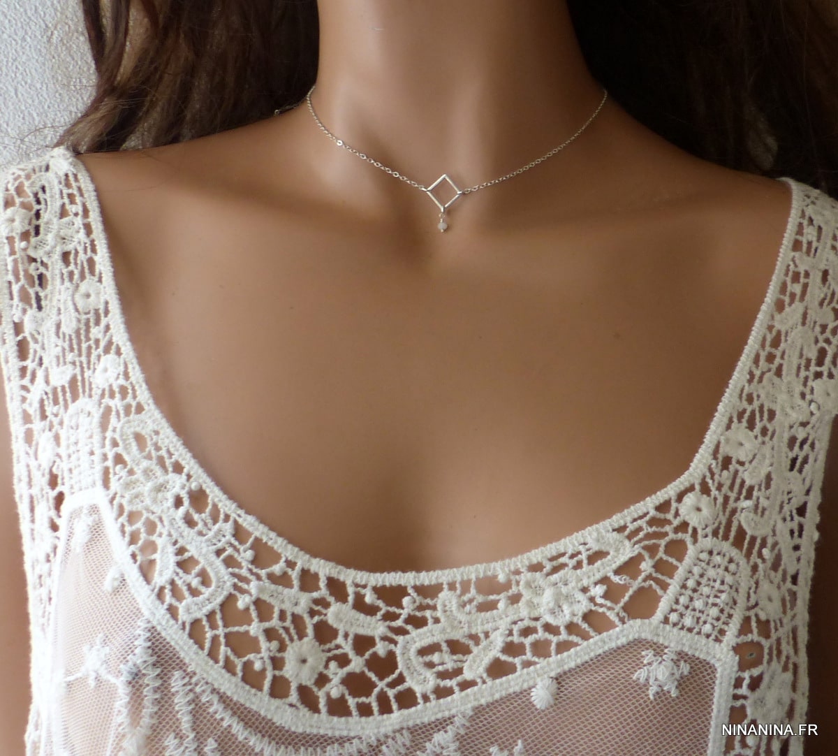 Esprit minimaliste pour ce Collier avec une Pierre de Lune ras de cou Argent 925 constitué d’un losange en Argent 925 et d’une pierre naturelle de votre choix montée sur une chaine en Argent 925.