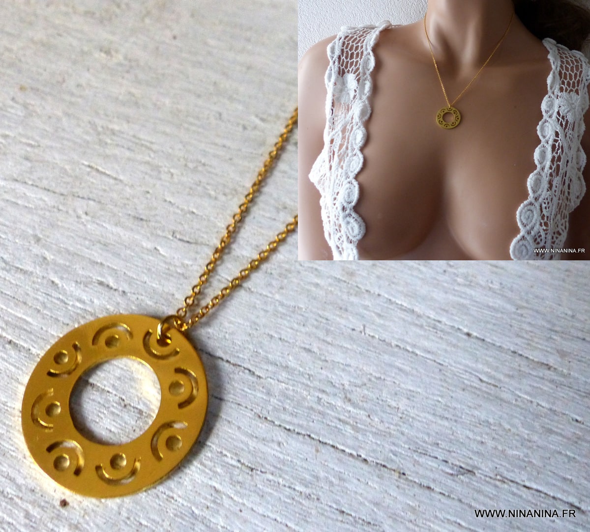 Cette pièce faite sur mesure convient pour la majorité des statures, la longueur proposée est de 46 + 5 cm de chainette de rallongement. Merci toutefois de laisser un commentaire si vous désirez une autre longueur. Diamètre : 2,6 cm. Ce collier karma est également disponible en acier argenté et or rose sur commande.