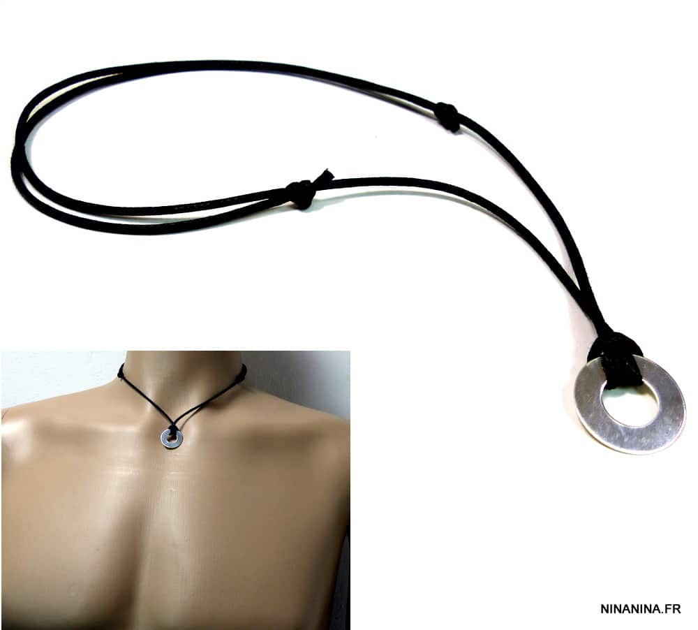 Collier homme cordon cible argent massif composé d’un disque rond en argent 925 monté sur un cordon de coton ciré noir (2 mm de diamètre).