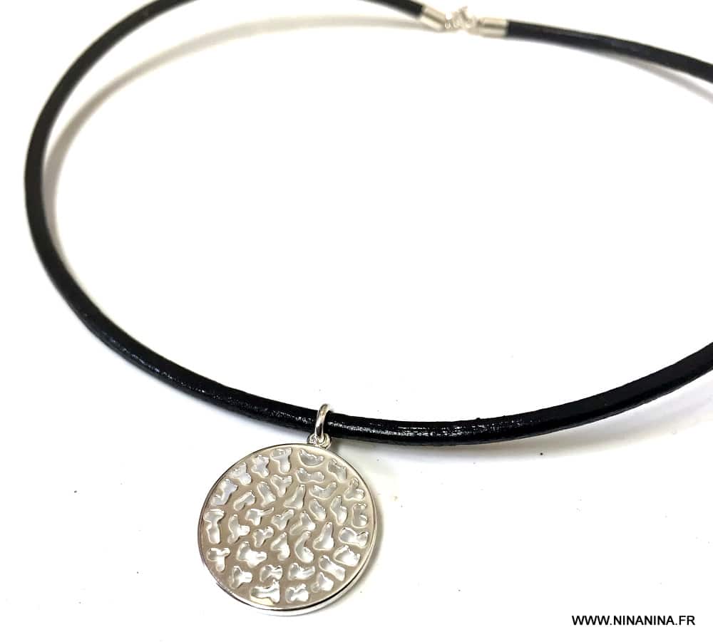 Collier cordon Cuir femme pendentif rond plaqué Argent