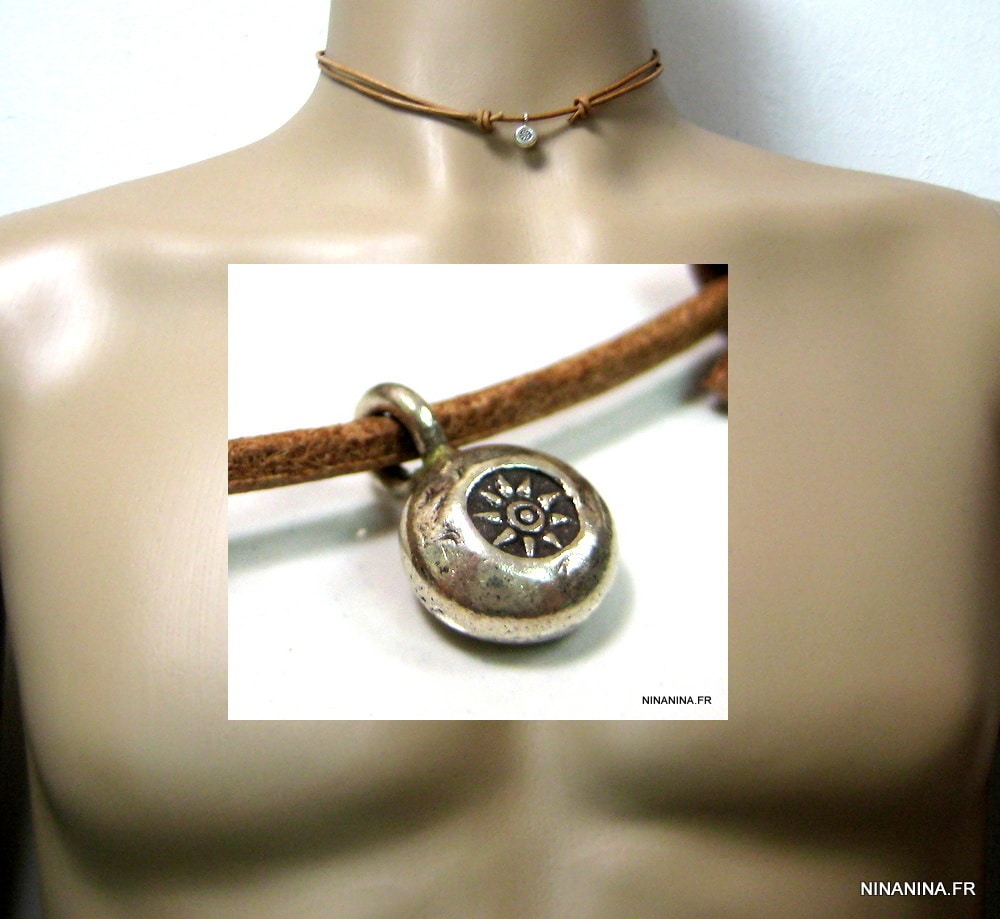 Collier cordon cuir tribal pendentif rond Argent 925 massif