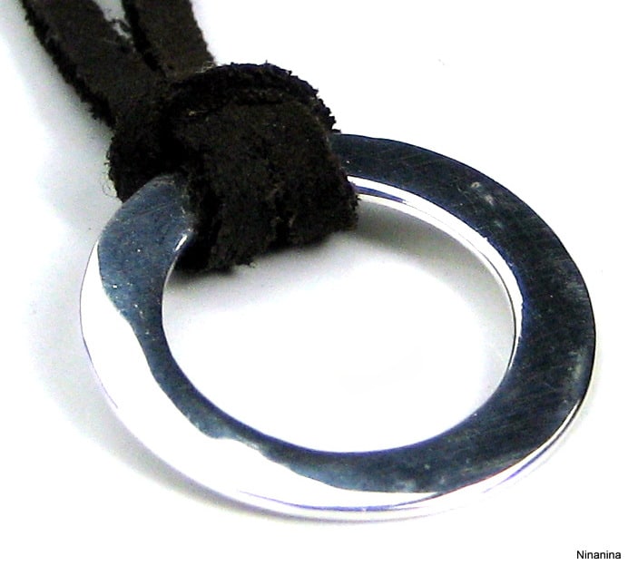 Collier cordon daim et plaqué argent composé d’un anneau en plaqué argent monté sur lacet de daim naturel(3 mm de large). Diamètre de l’anneau : 2,7 cm. Longueur totale (fermoir compris) : 42 cm environ. Fermoir mousqueton. Existe en naturel, noir, marron chocolat et turquoise. Livré dans sa pochette d’organza. Bijou 100% fait main.