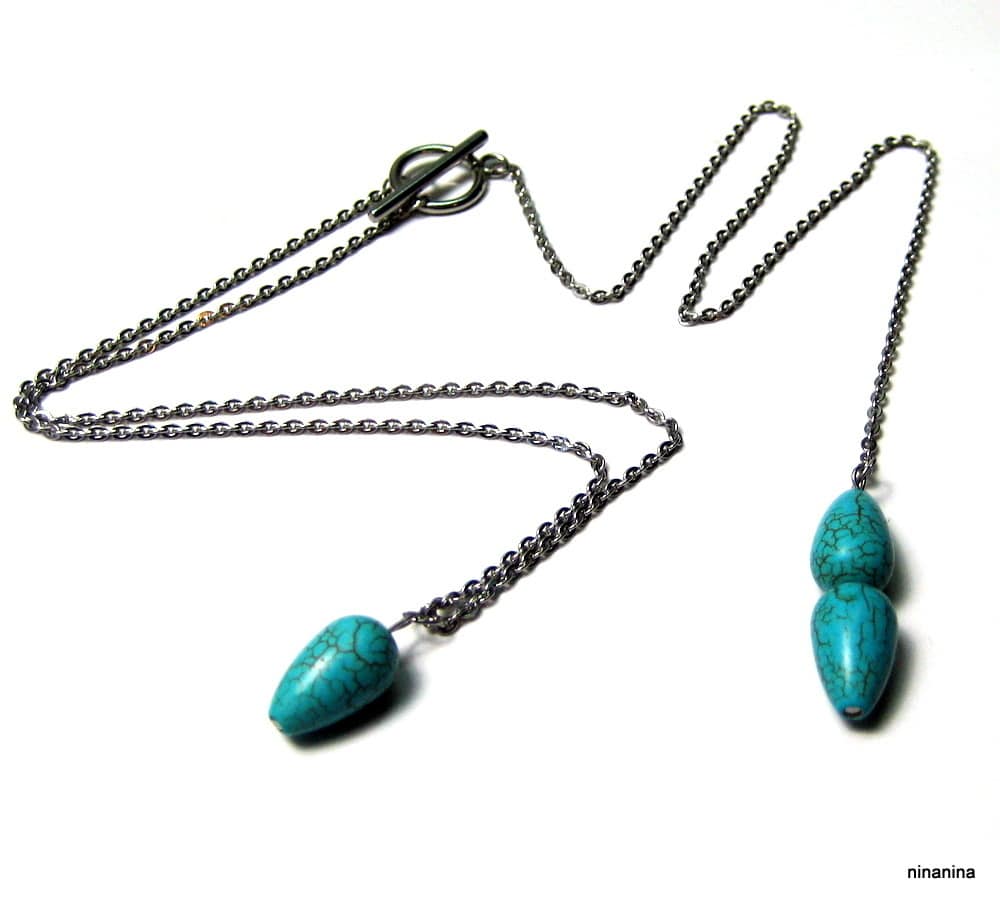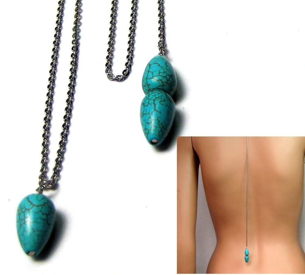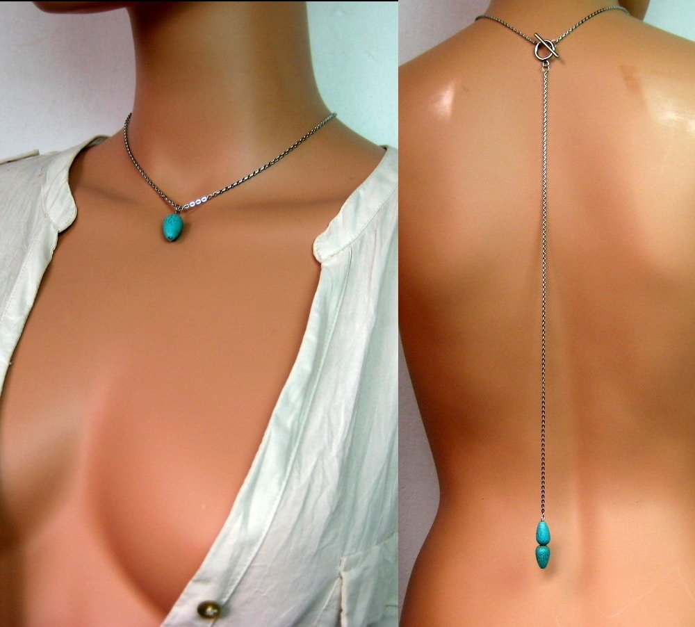 Collier de dos acier inoxydable turquoise composé de gouttes en magnésite turquoise montées sur une fine chainette en acier inoxydable. Dim des gouttes : 1,8 X 1 cm. Longueur (fermoir compris) : 40 cm environ. Longueur de la chaine de dos : 30 cm environ; Fermoir T. Livré dans sa pochette d’organza. Bijou 100% fait-main.