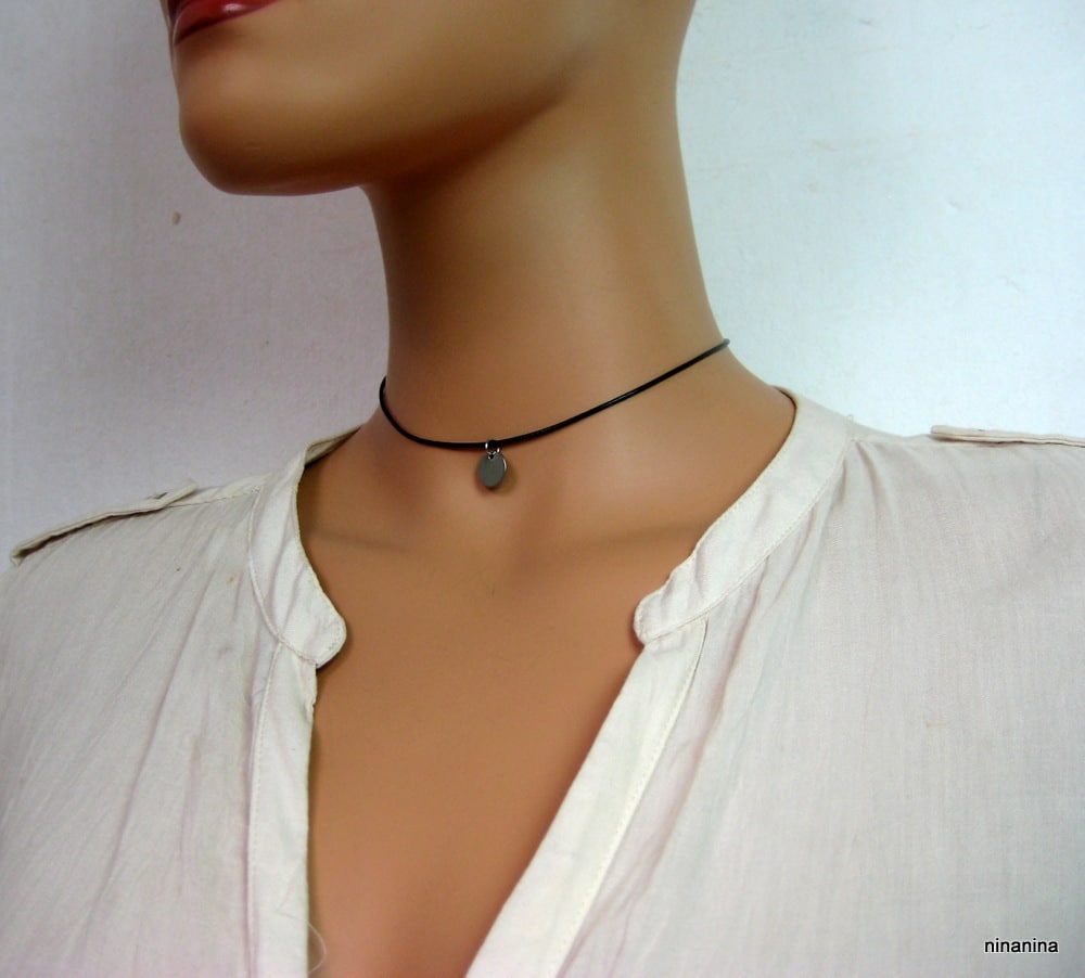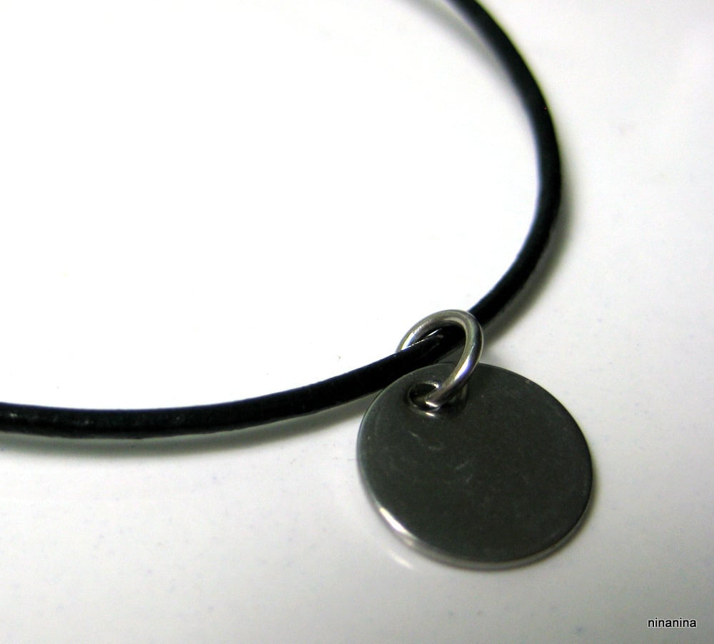 Collier de dos cordon cuir composé de pastilles rondes en acier inoxydable montées sur un cordon de cuir (1mm). Diamètre des pastilles : 0,8 et 1 cm. Longueur : 65 cm env réglable par n?ud coulissant. Livré dans sa pochette d’organza. Bijou 100% fait-main