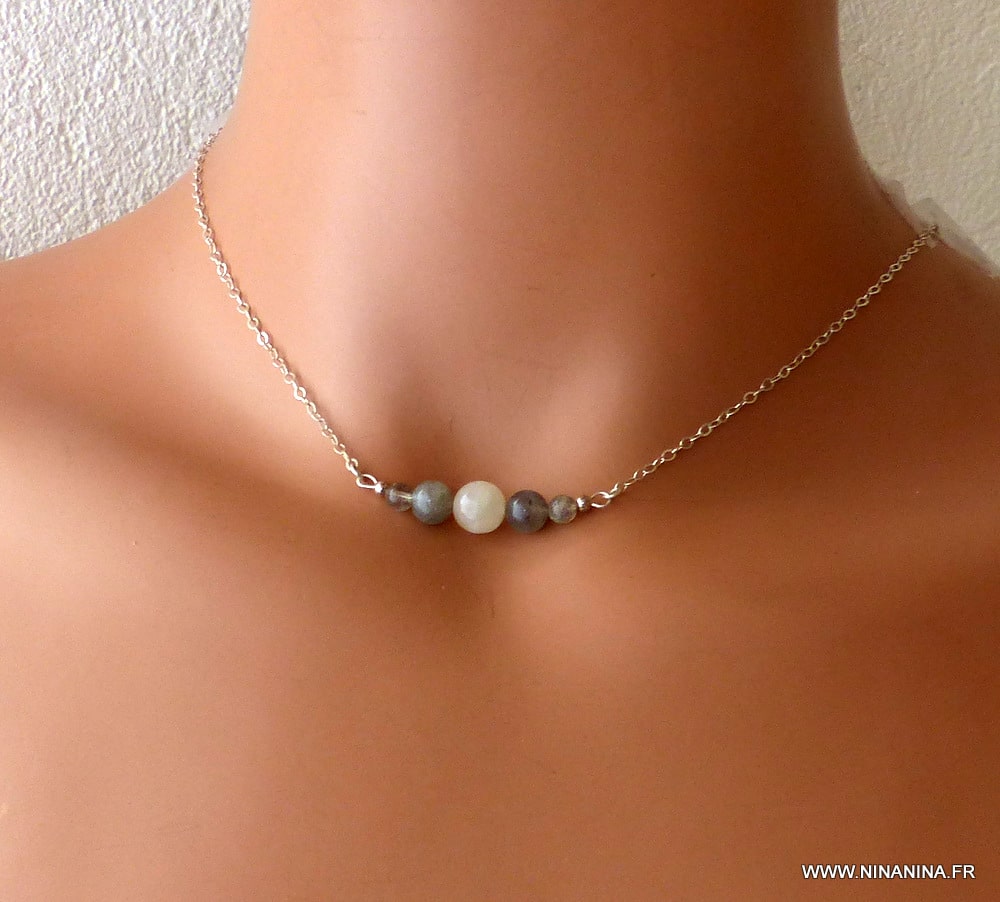 Collier en pierre de lune et labradorite chaine argent composé de perles pierres de lune et labradorites naturelles montées sur une chainette en argent 925.