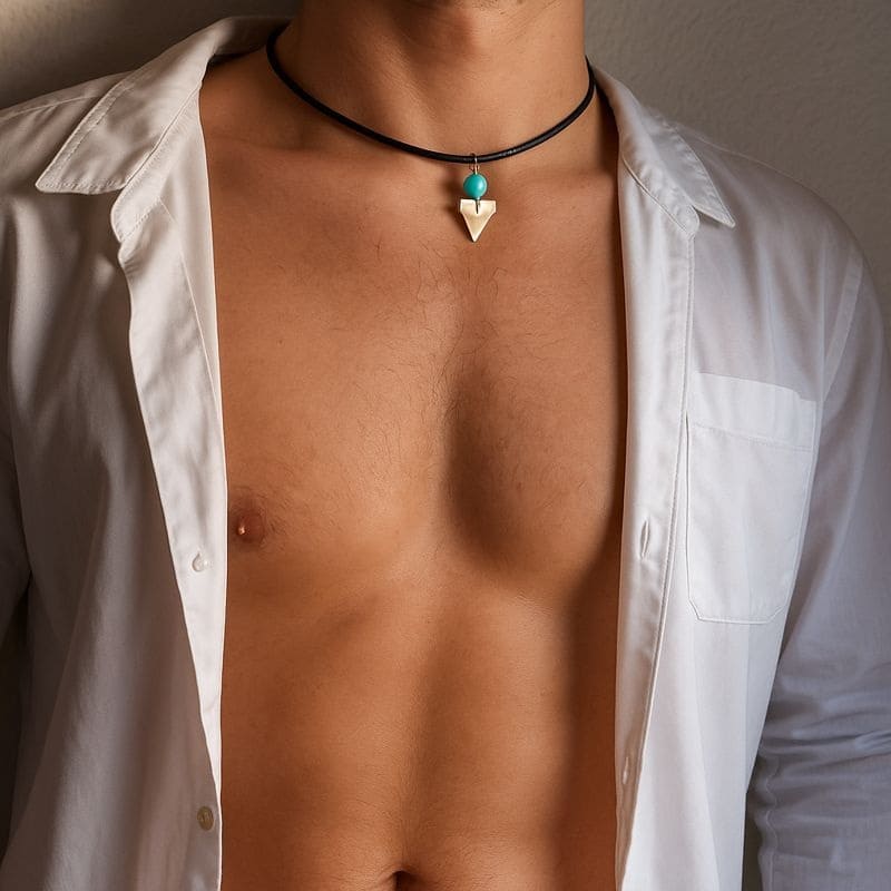 La dent de requin apporte une touche forte et masculine, tandis que la turquoise illumine le décolleté et ajoute une note spirituelle. Ce collier s’accorde aussi très bien avec des bracelets en cuir, en perles naturelles ou en bois pour un ensemble harmonieux au style authentique.