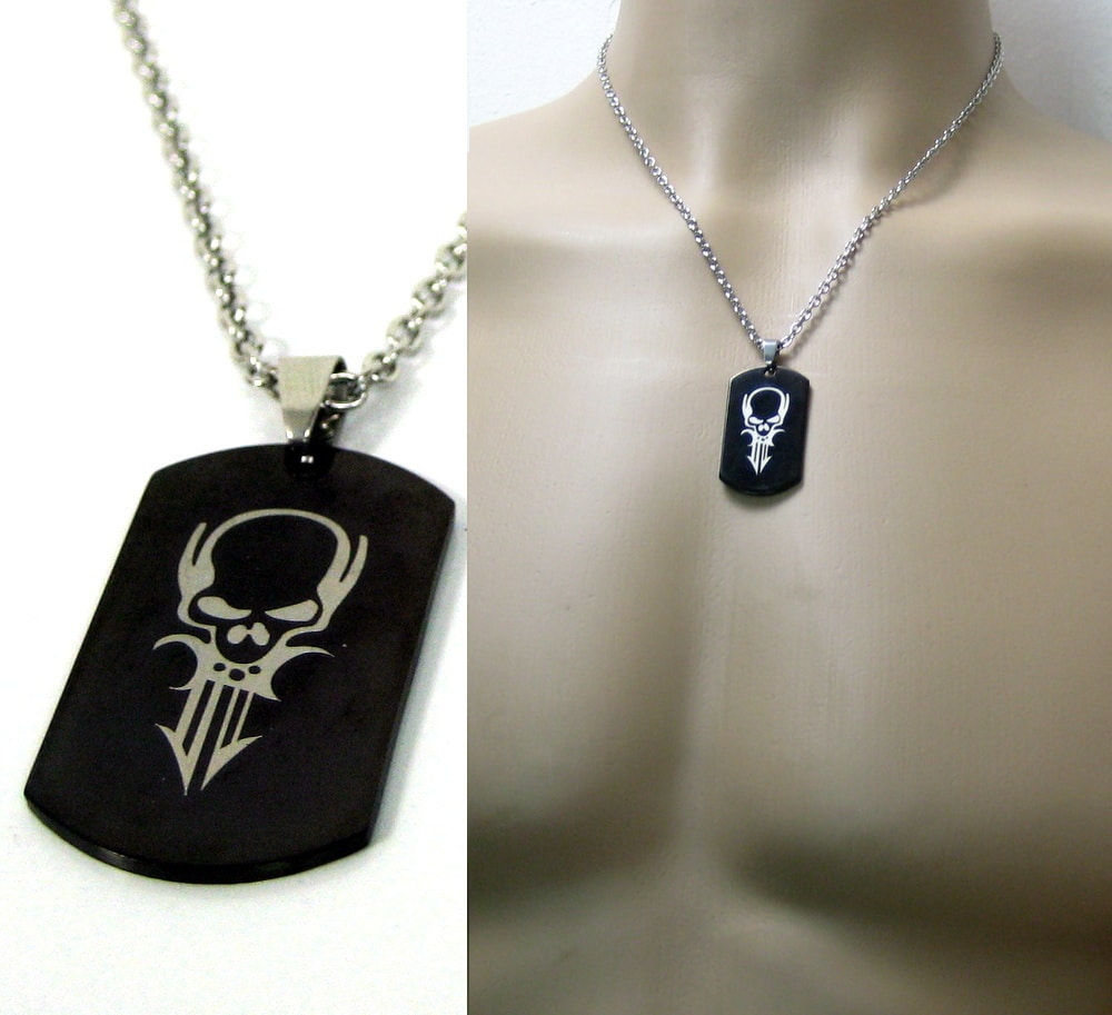 Collier homme tête de mort acier inoxydable argenté composé d’un pendentif rectangulaire en acier inoxydable noir et argent monté sur une chaine maillons ovales en métal noir. Dim du pendentif : 4 X 2,3 cm env. Fermoir mousqueton. Longueur : 70 cm env. Livré dans sa pochette d’organza. Bijou 100% fait main.