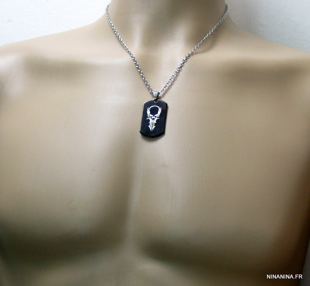 Collier homme tête de mort acier inoxydable argenté composé d’un pendentif rectangulaire en acier inoxydable noir et argent monté sur une chaine maillons ovales en métal noir.