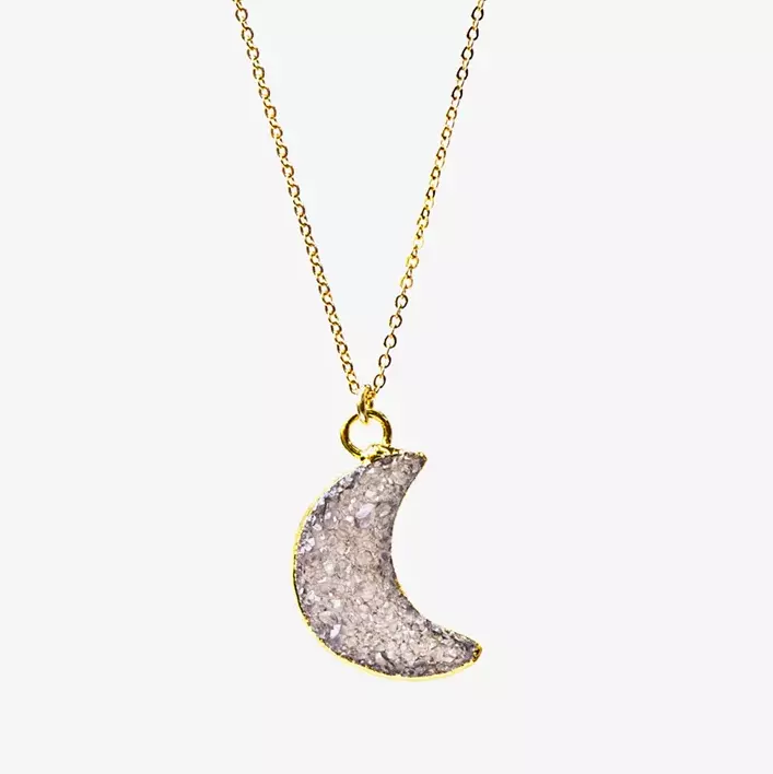 Le pendentif lune en agate druzy et ses minuscules cristaux de quartz donnent une apparence étincelante unique qui ajoutera une touche de brillance et de glamour à n’importe quelle tenue. Que ce soit pour une occasion spéciale ou pour une tenue de tous les jours, ce collier est polyvalent et peut être porté avec différents styles.