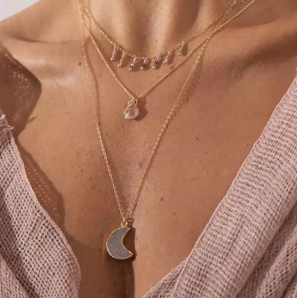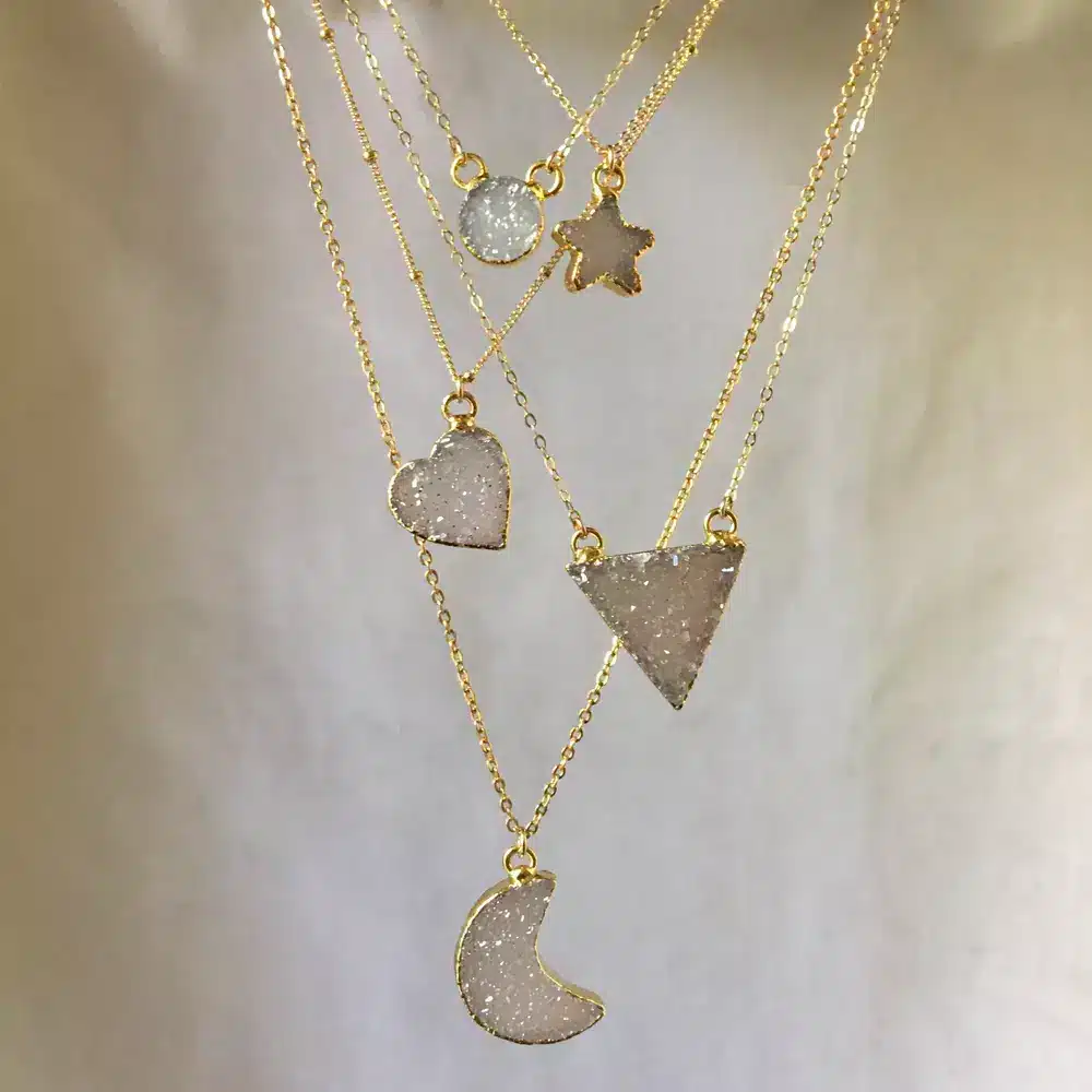 Un bijou celeste avec pendentif croissant de lune en agate druzzy est un bijou polyvalent qui peut être stylisé de nombreuses façons pour diverses occasions. Que vous optiez pour un look décontracté, élégant ou bohème, ce bijou unique saura apporter une touche de charme et de sophistication à votre tenue.