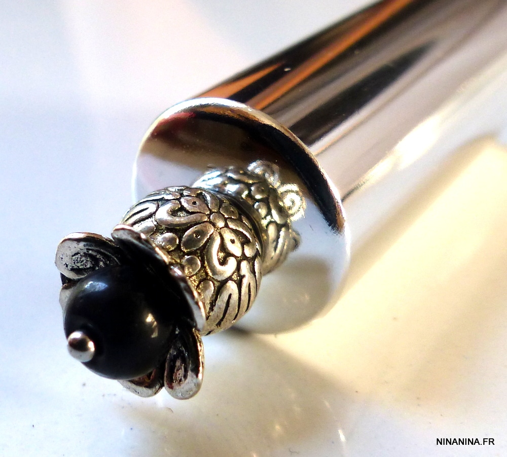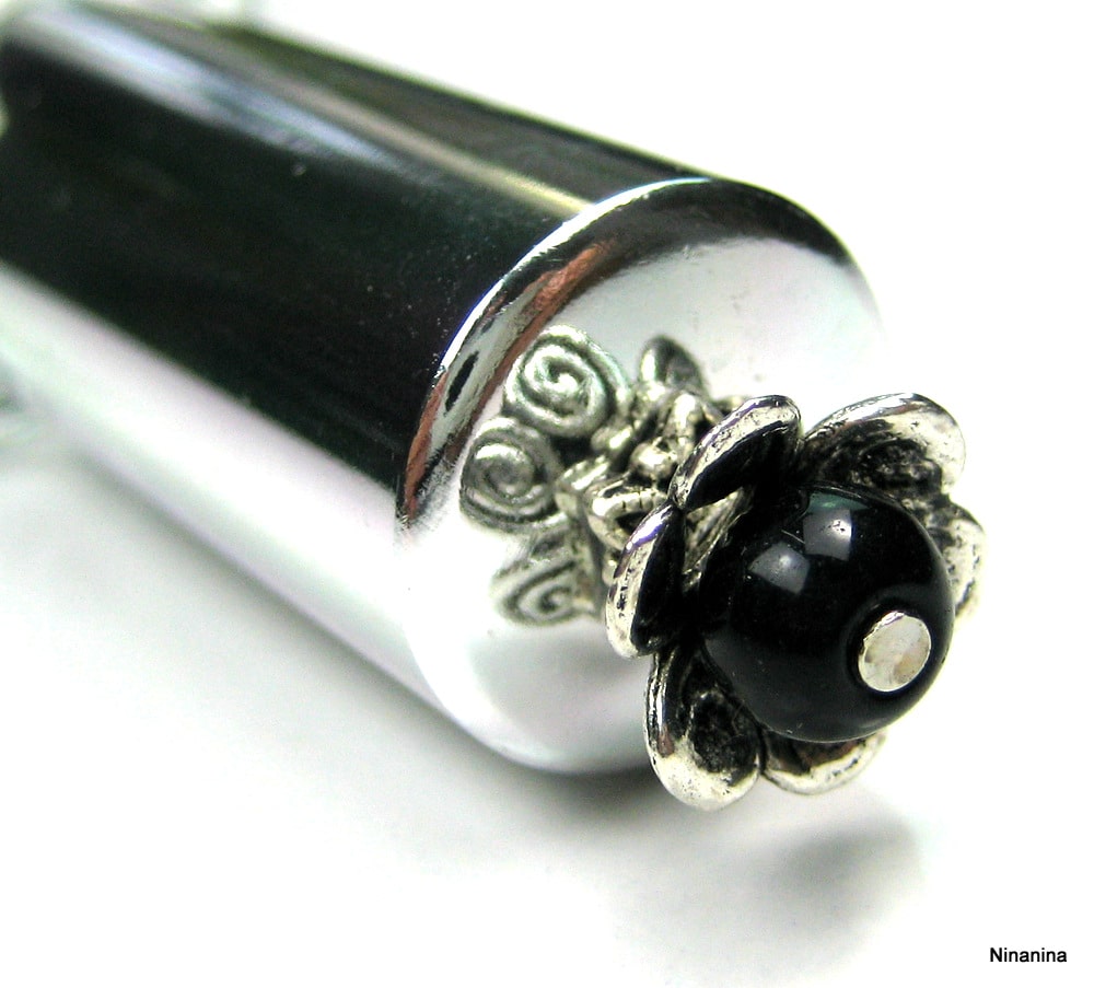 Composé d’un flacon rectangulaire en verre transparent sur lequel est collé une petite fleur en métal argenté, assorti d’une pompe spray en métal argenté rehaussée d’une fleur composée d’une perle noire en verre et d’une pièce en métal argenté, ce vaporisateur de sac se glisse dans une trousse beauté, une valise ou un sac à main.