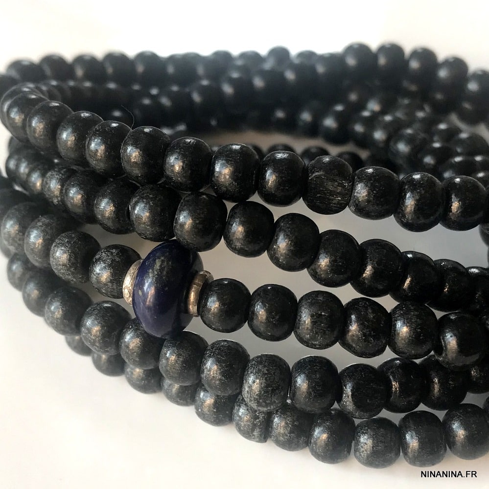 Lapis Lazuli Bracelet Homme perle bois multi tours composé de perles de bois rondes noir, de deux rondelles en argent 925 et d’une pierre lapis lazzuli montés sur un lien elastique, à enrouler autour du poignet (5 tours). Longueur : 100 cm (toute autre longueur possible). Livré dans sa pochette d’organza. Bijou 100% fait main.