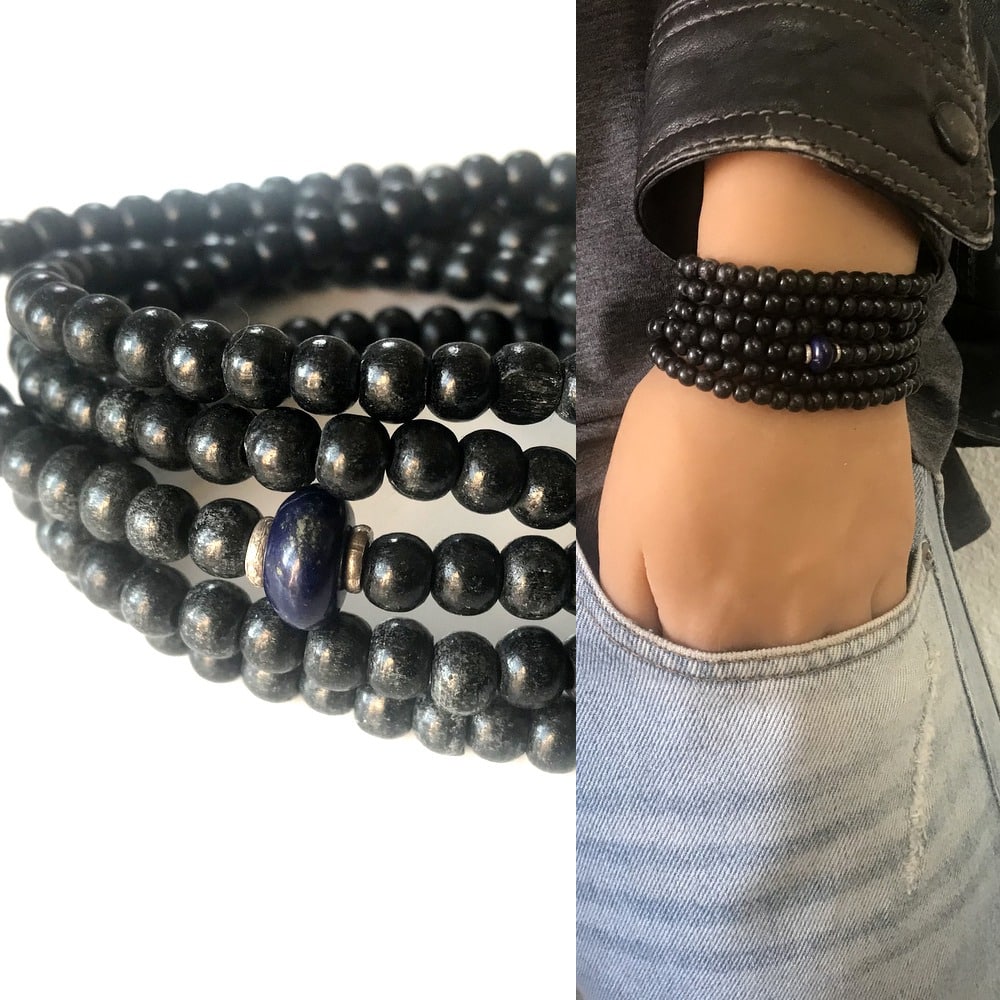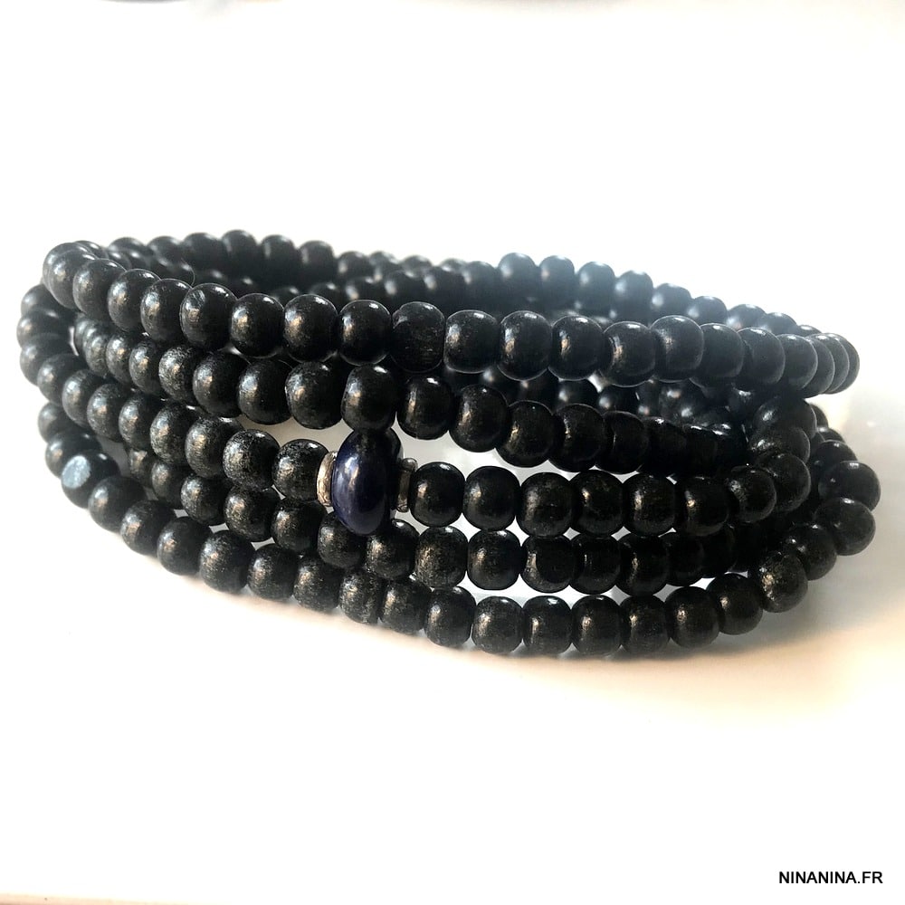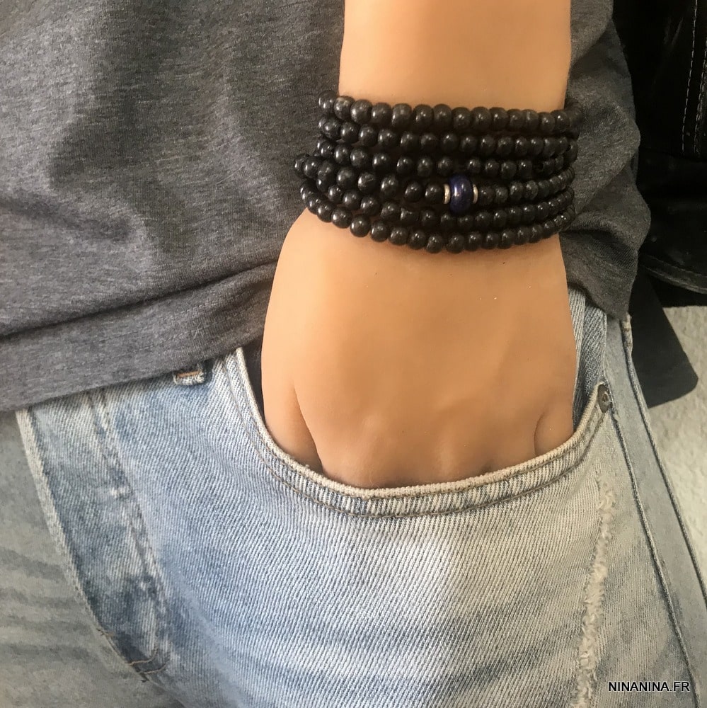 Lapis Lazuli Bracelet Homme perle bois multi tours composé de perles de bois rondes noir, de deux rondelles en argent 925 et d’une pierre lapis lazzuli montés sur un lien elastique, à enrouler autour du poignet (5 tours).