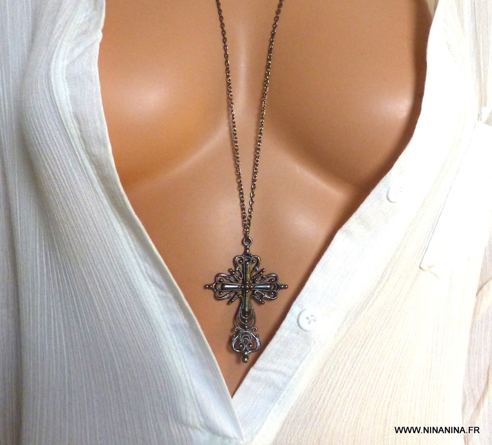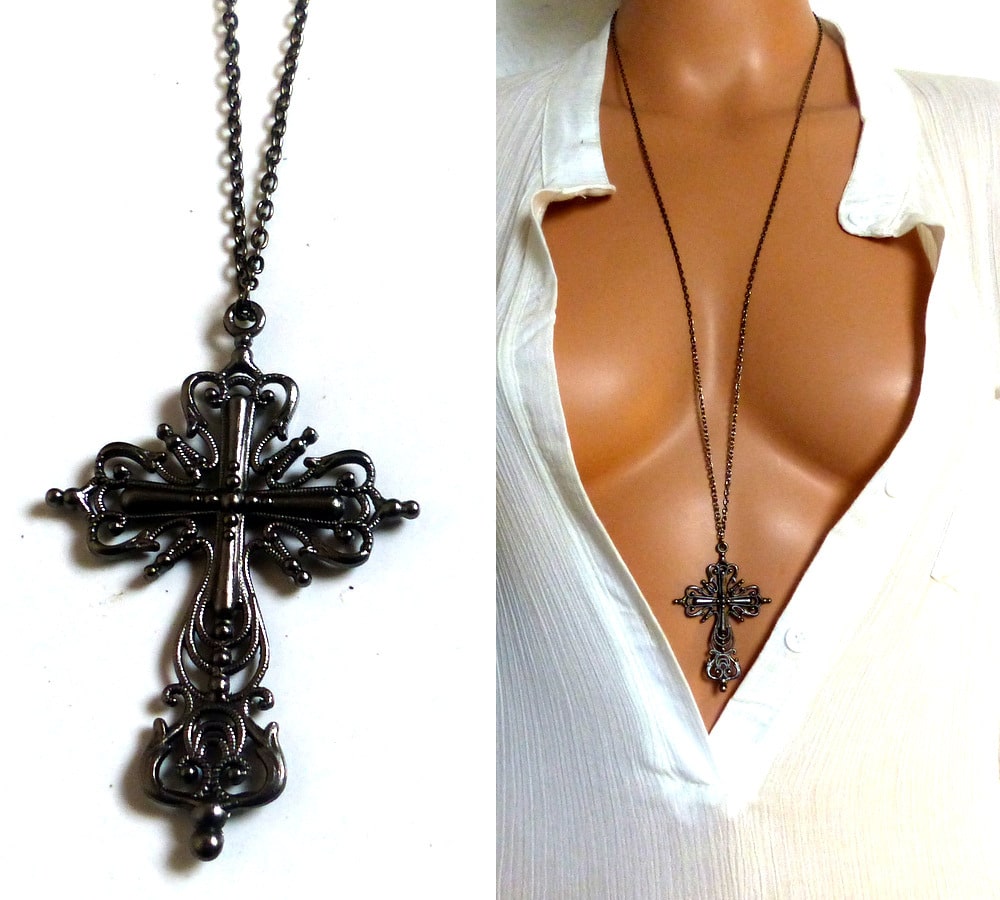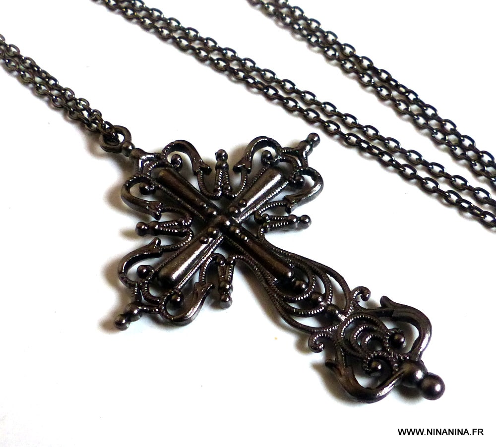 Longue chaine noire pendentif croix gothique – collier femme