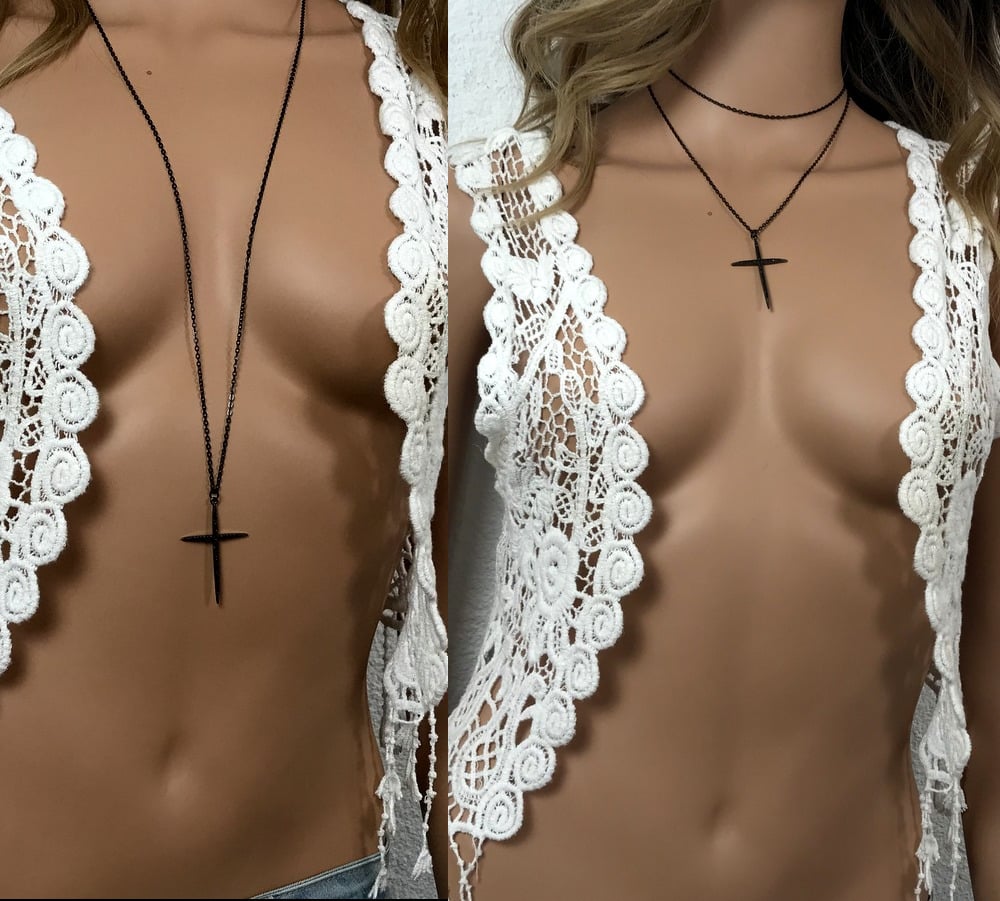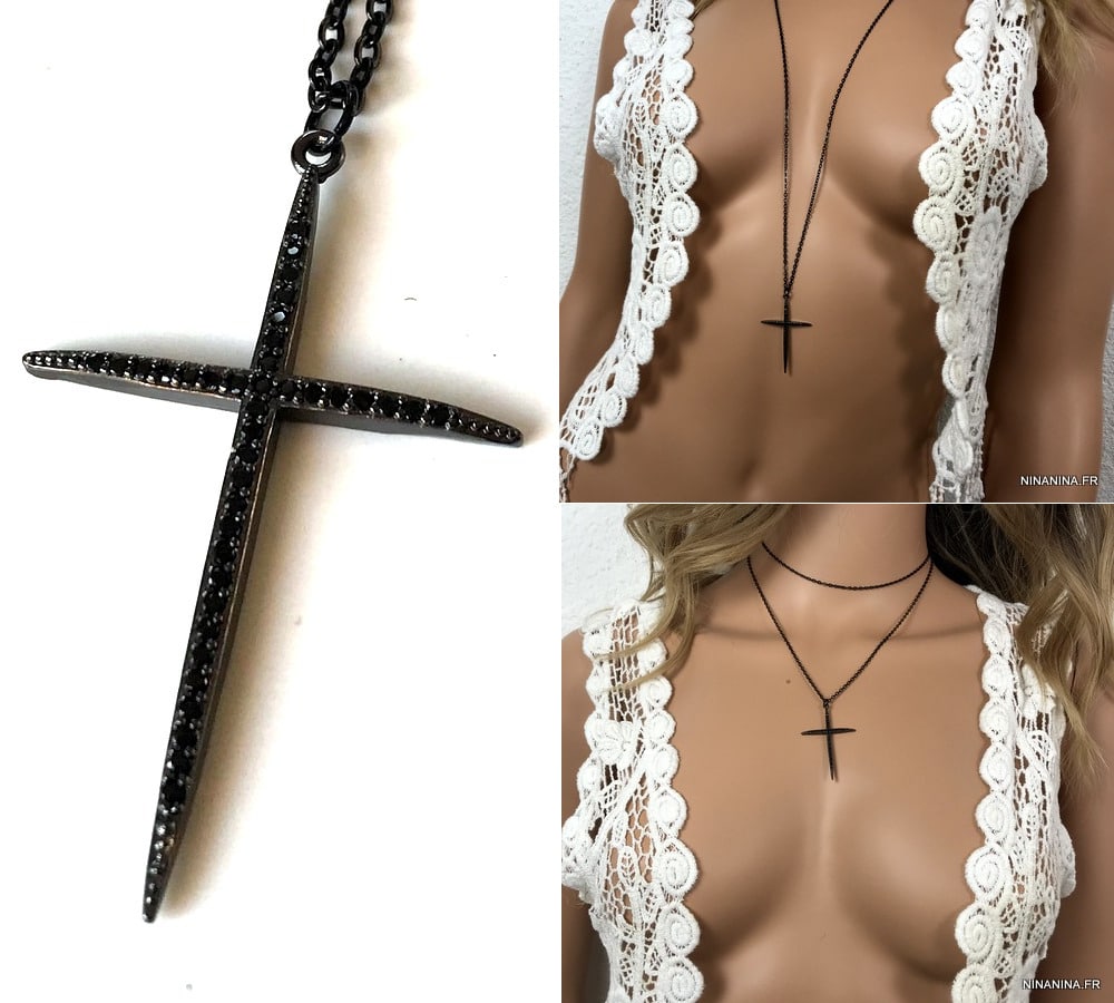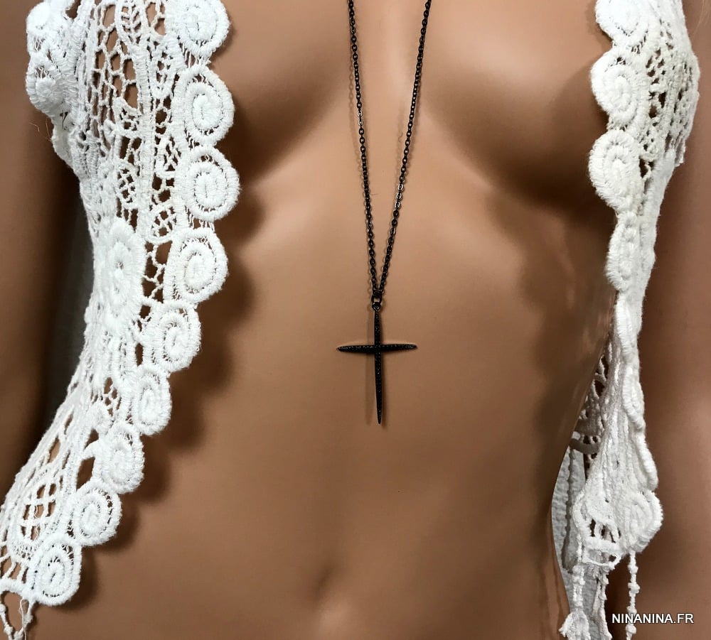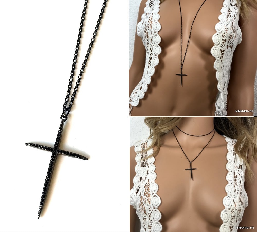 Pendentif croix zirconium noir – Collier long sautoir femme