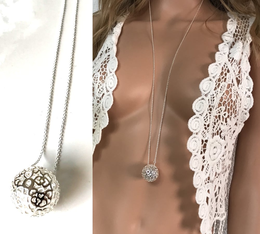 Sautoir boule plaquĆ© Argent – Collier long femme composĆ© d’un pendentif rond filigranĆ© montĆ© sur une fine chainette en plaquĆ© argent. DiamĆØtre du pendentif : 2 cm.
